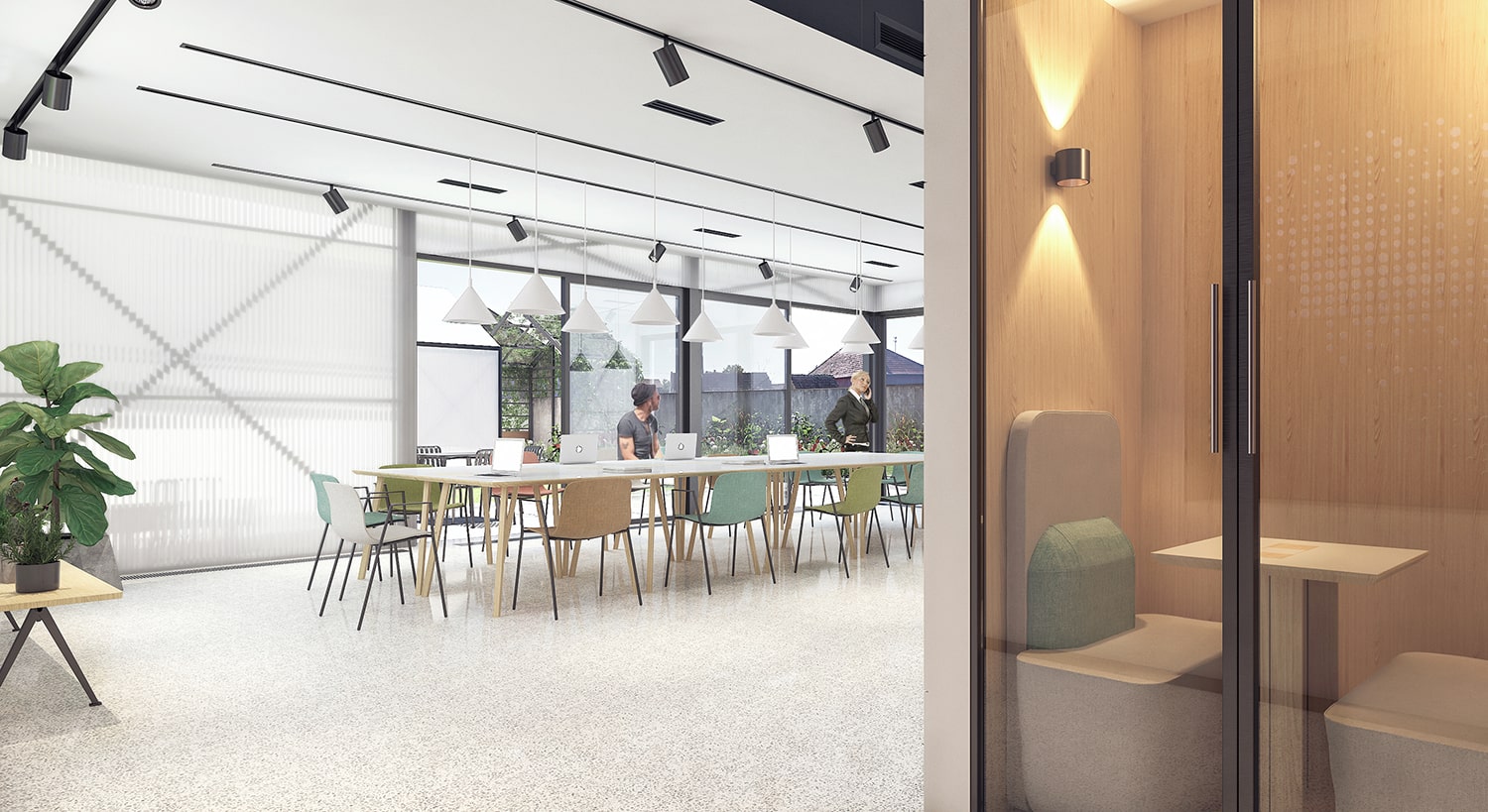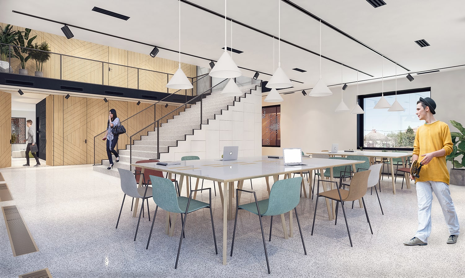 The compound is consisted of two buildings – the bigger one, reconstructed and enlarged with additional floor for co-working and co-living and the smaller ground floor unit that serves as an extension of co-working space during summer months.