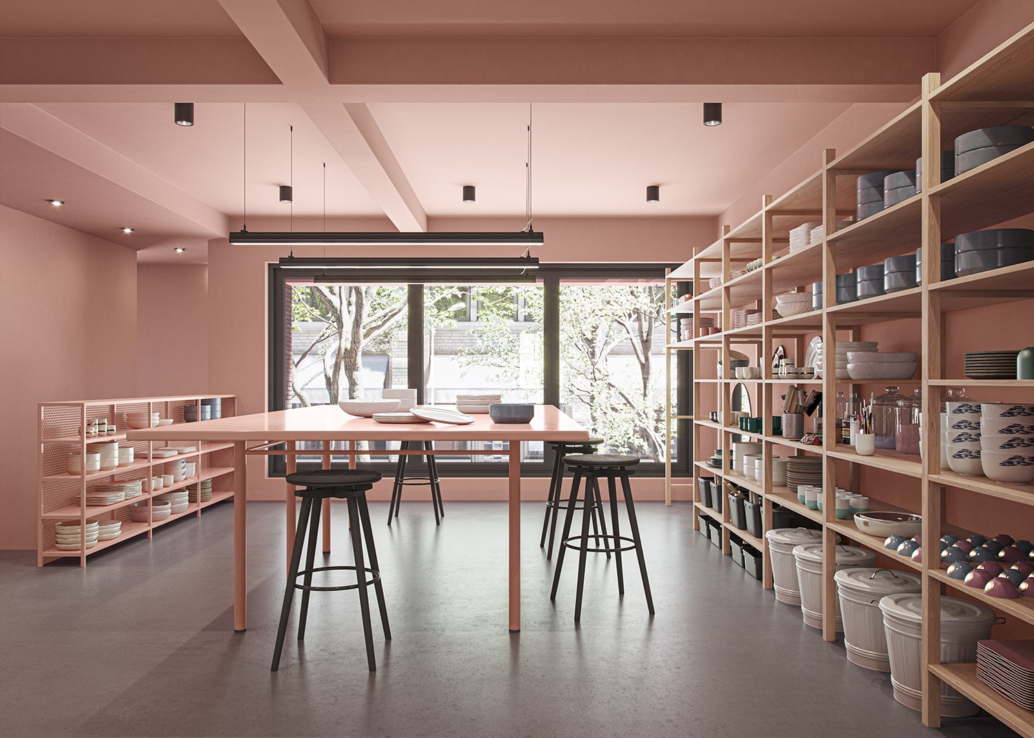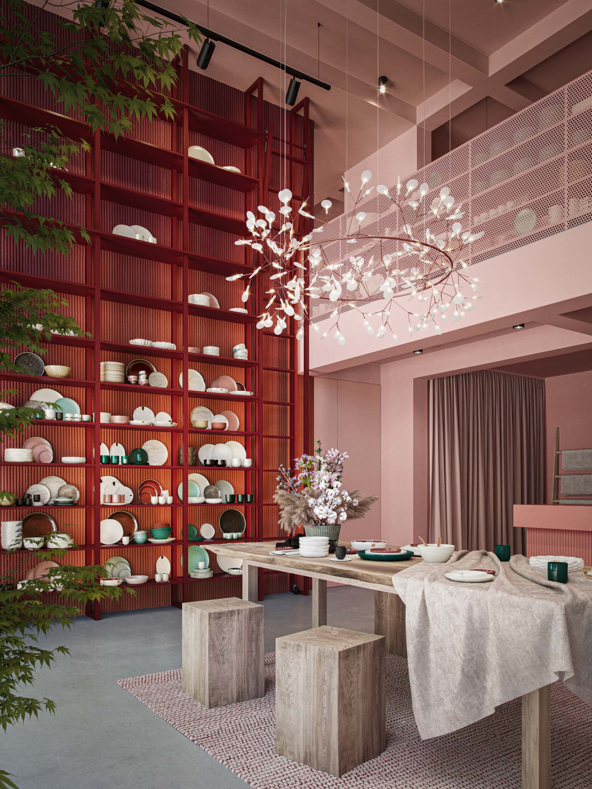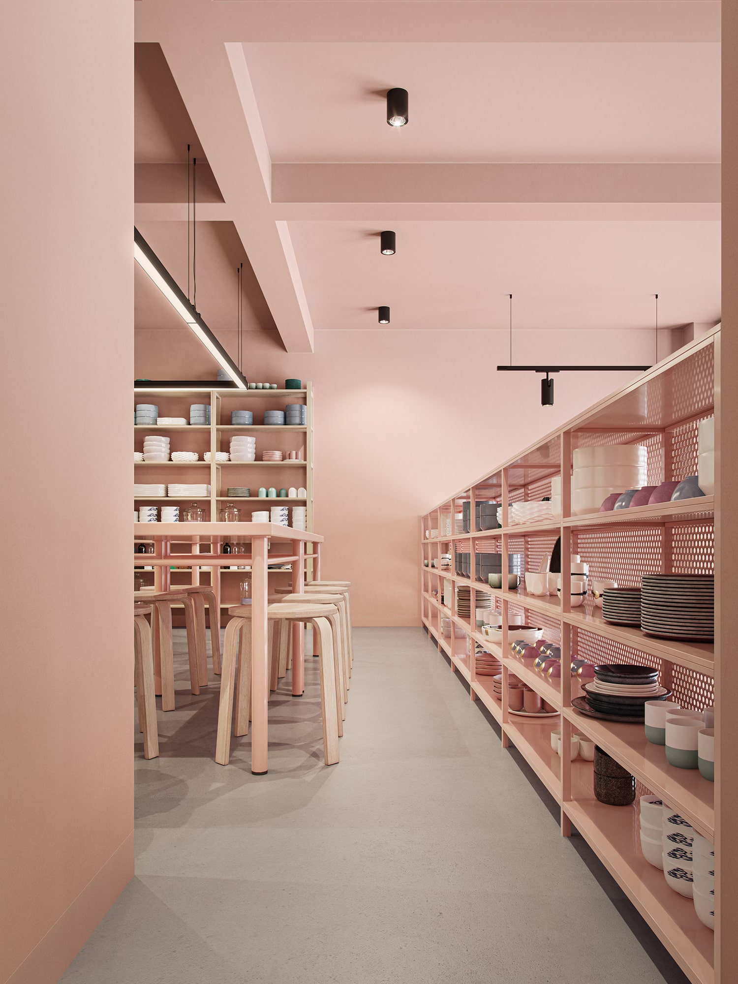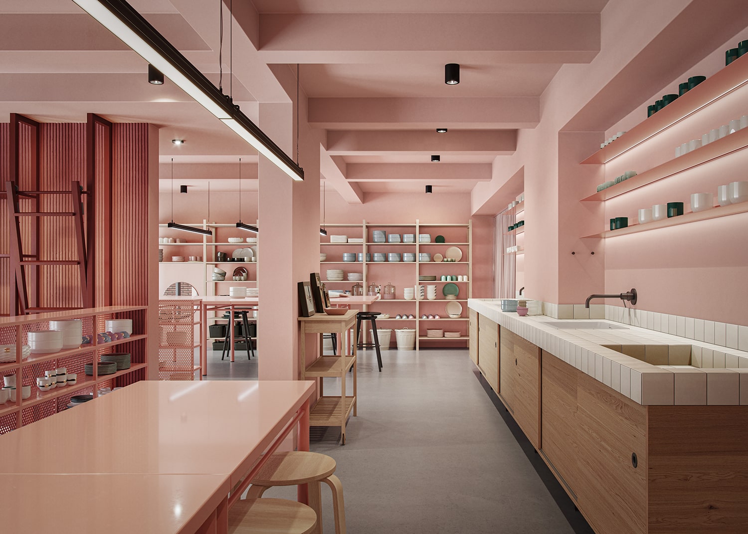 By blending different programs, we managed to place the entire production course of porcelain, from a raw material to the artisan object within one space. Dividing it into three zones, we created a work studio and a workshop space on the first floor and a double-height retail area on the ground floor. Carefully curated handcrafted porcelain tableware is displayed on a bespoke steel shelf and a lovely, rustic dining table at the very entrance of the store.