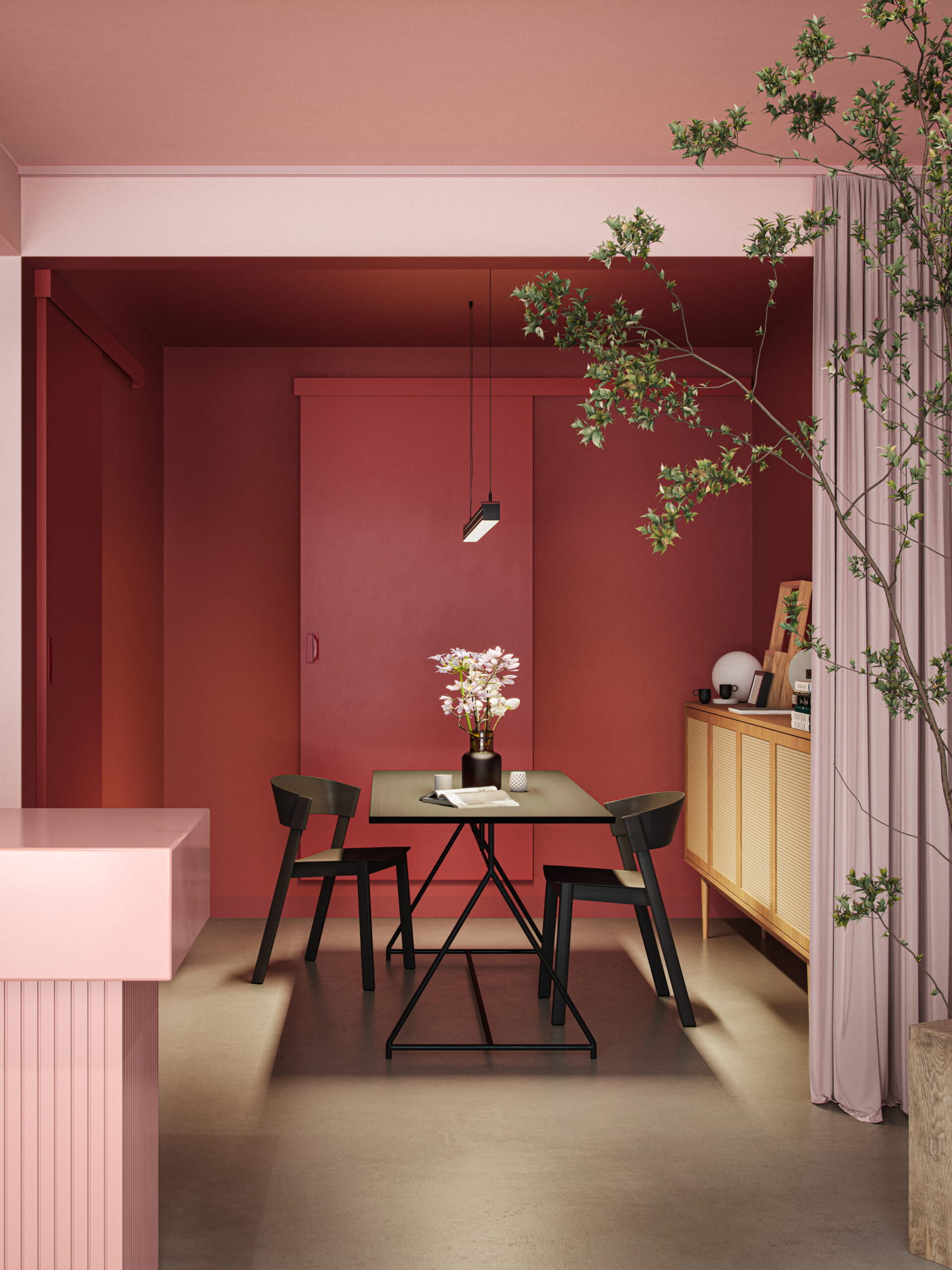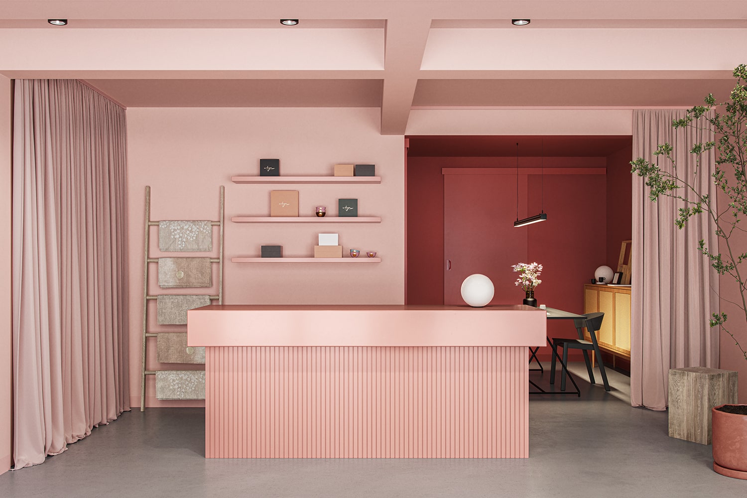 The entire space is bathed in three warm shades of pink, while elements made of oak wood on the first floor soften the atmosphere. Tranquil combination of colors and materials sets the perfect tone for creative work and matches the essence of Boya brand. Lovely energy and continuous inspiration is what makes this picturesque space in a cozy part of the city different and special.