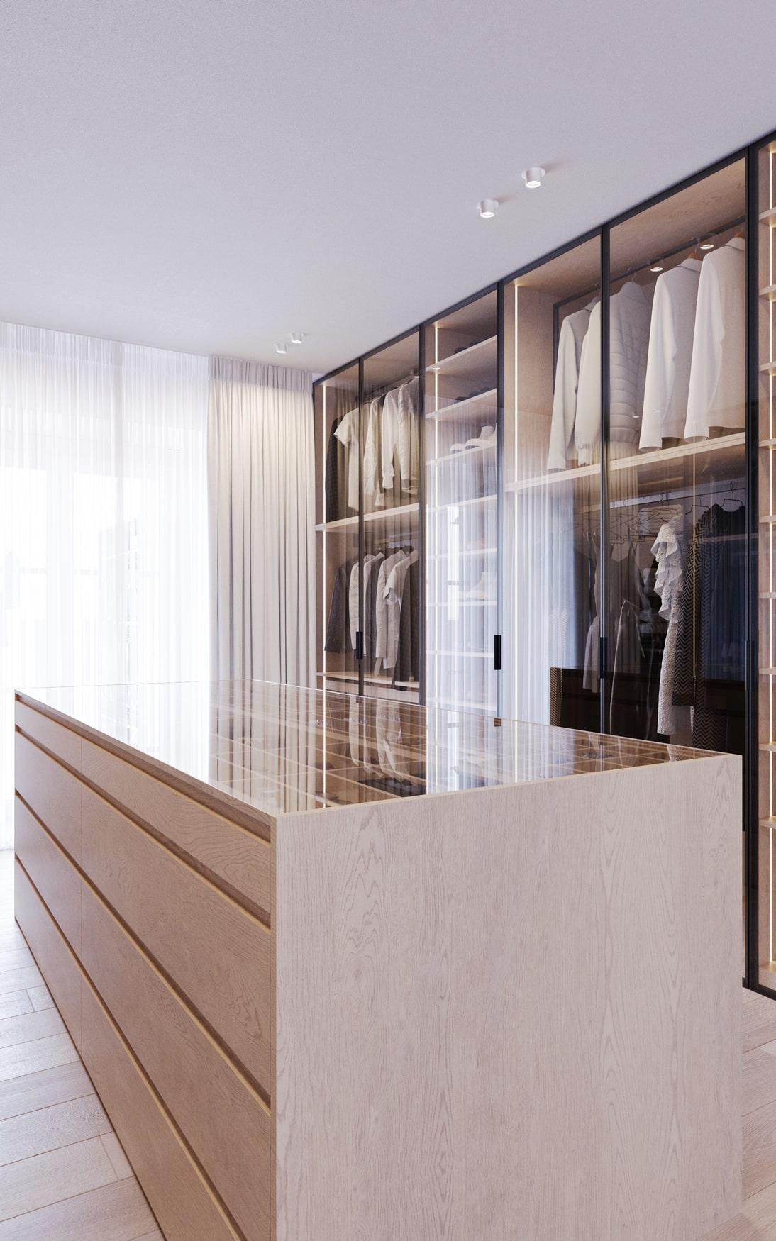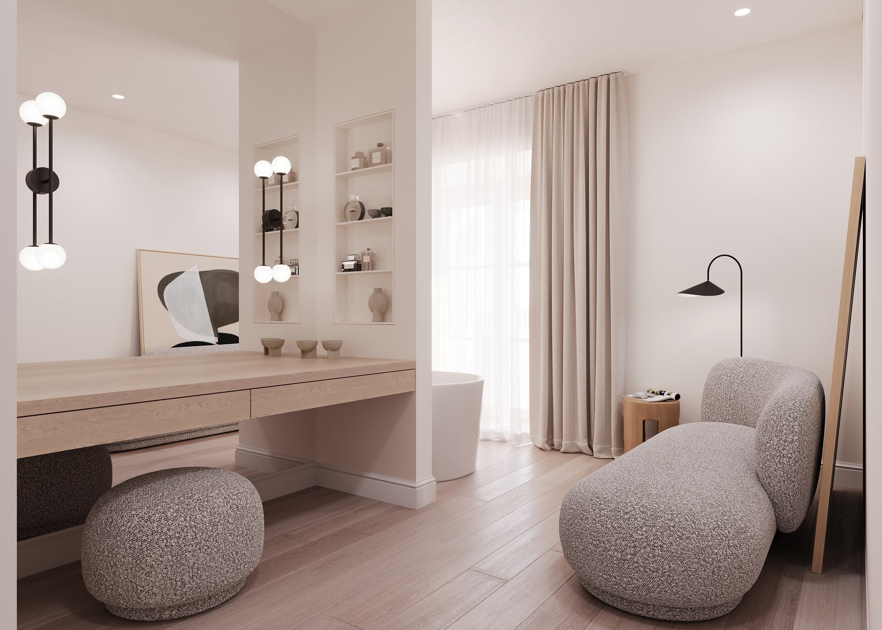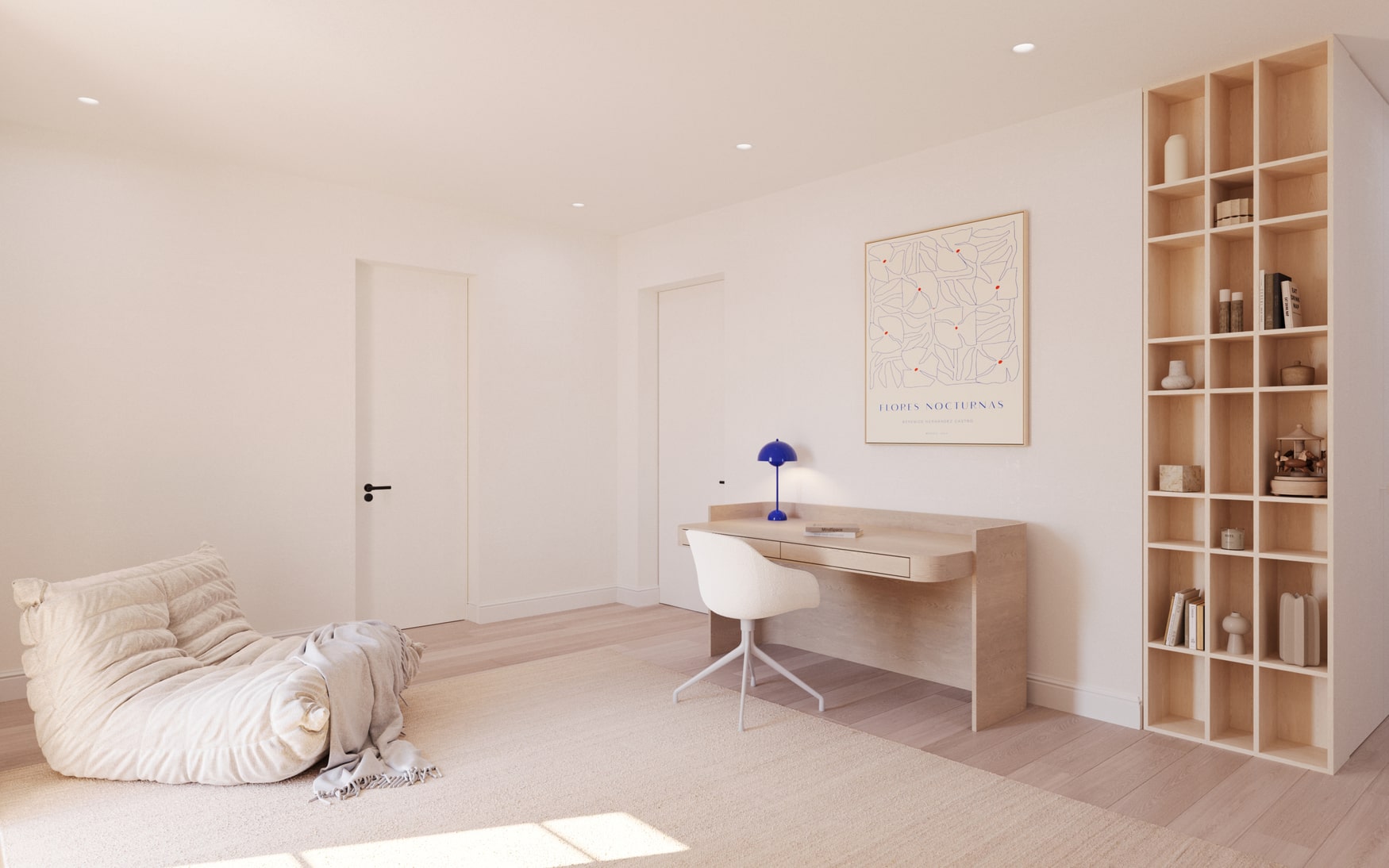 Ascending the spectacular staircase leads to the upper floor, where a stylish study room awaits on one side. The central hallway guides you to the master block for the parents, creatively reorganized to optimize space. The sleeping area, strategically placed to capture the best views, is complemented by a thoughtfully designed wardrobe zone and a luxurious bathroom with various ambiences.