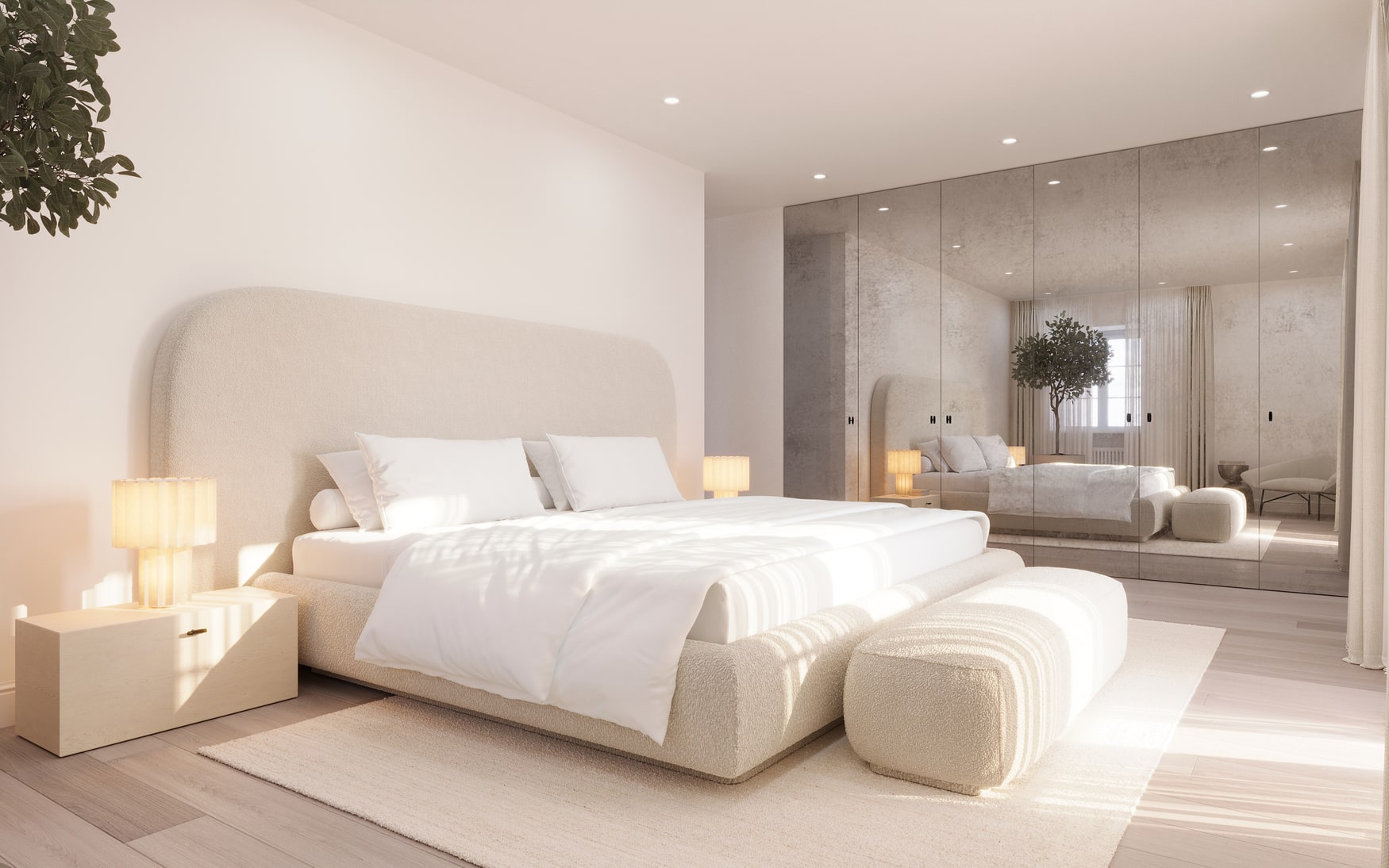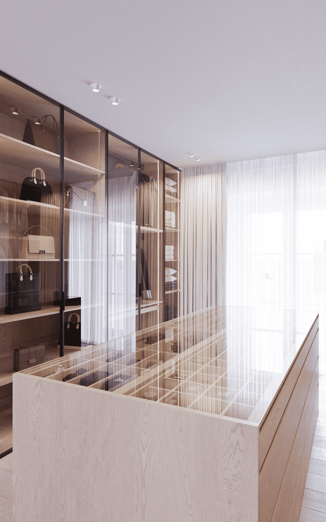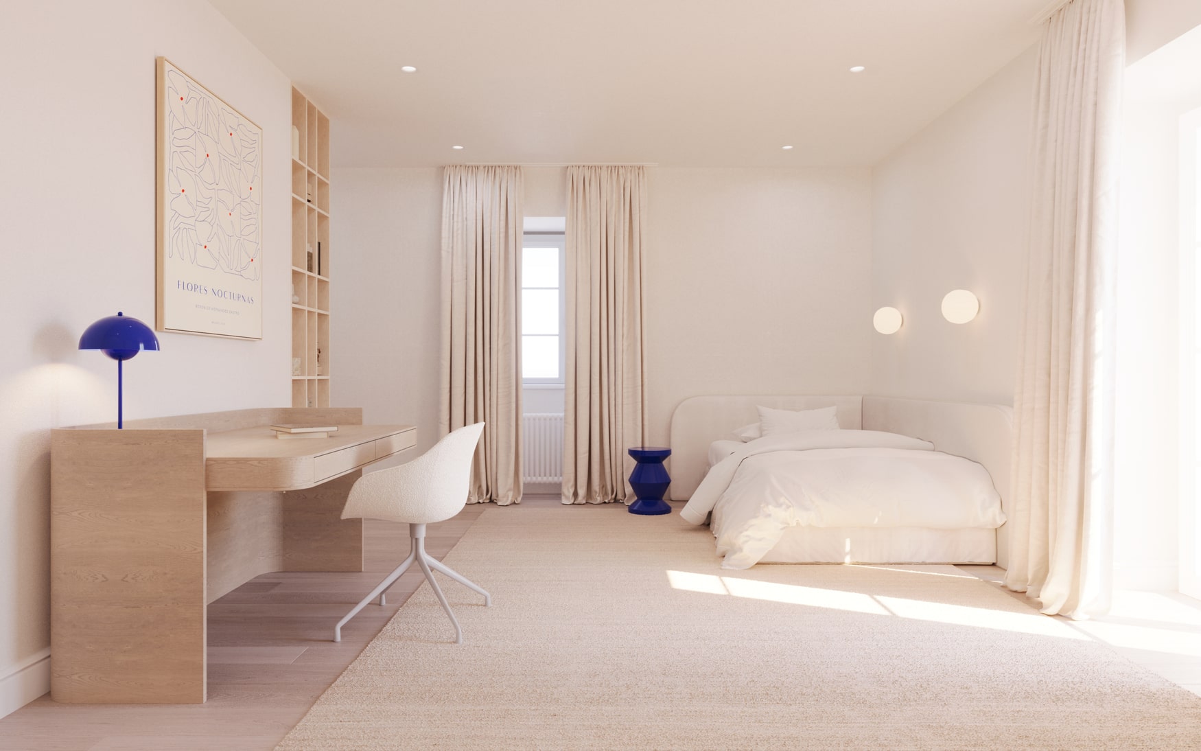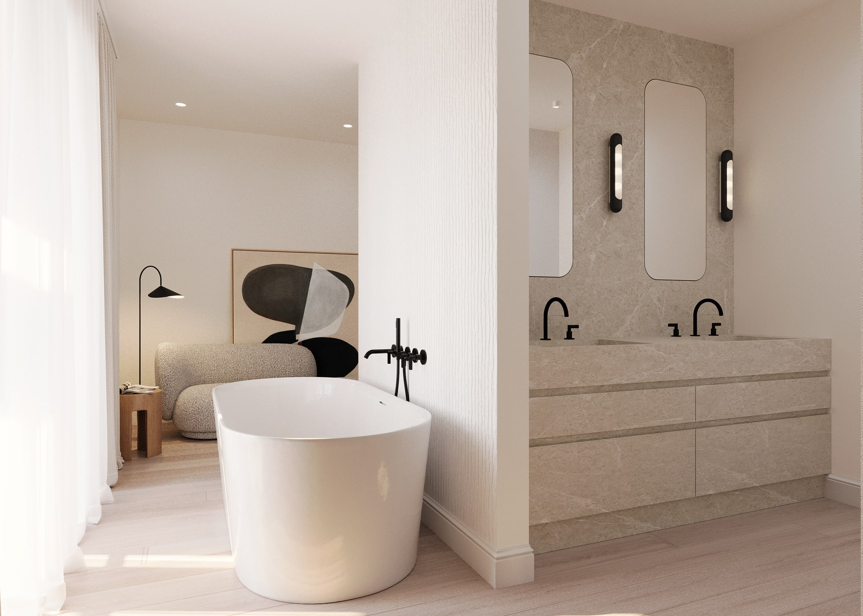 Ascending the spectacular staircase leads to the upper floor, where a stylish study room awaits on one side. The central hallway guides you to the master block for the parents, creatively reorganized to optimize space. The sleeping area, strategically placed to capture the best views, is complemented by a thoughtfully designed wardrobe zone and a luxurious bathroom with various ambiences.