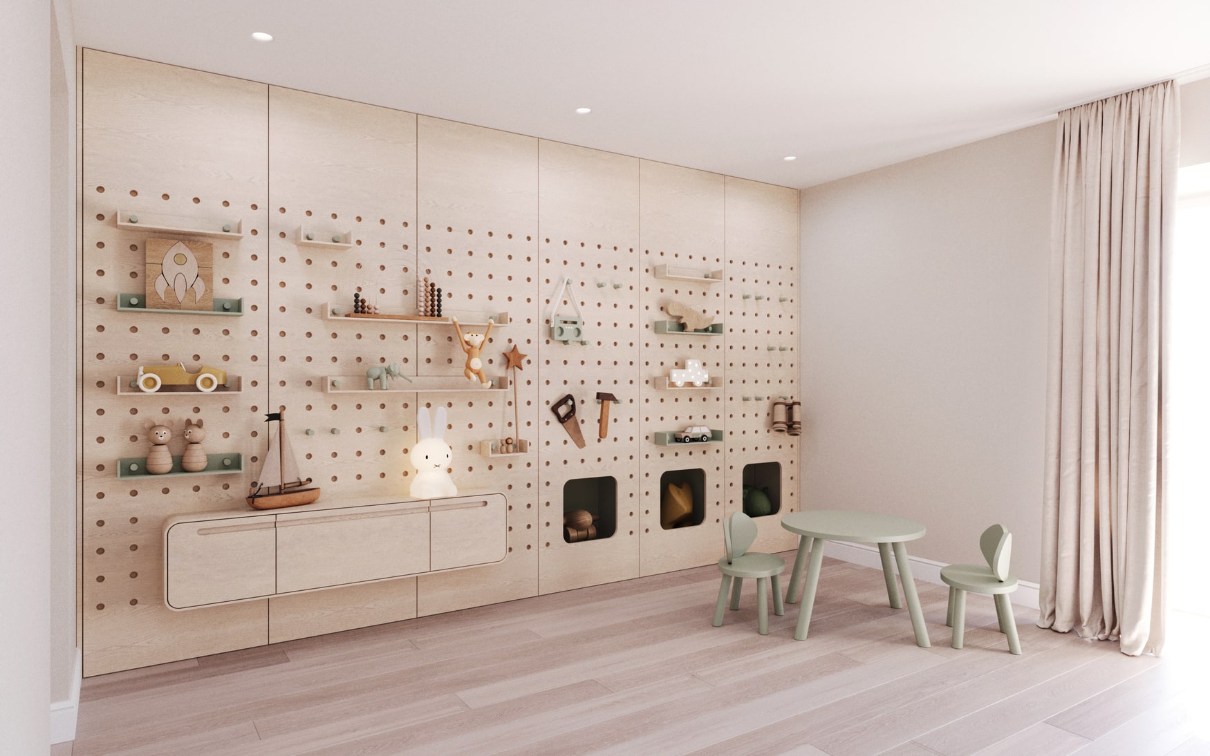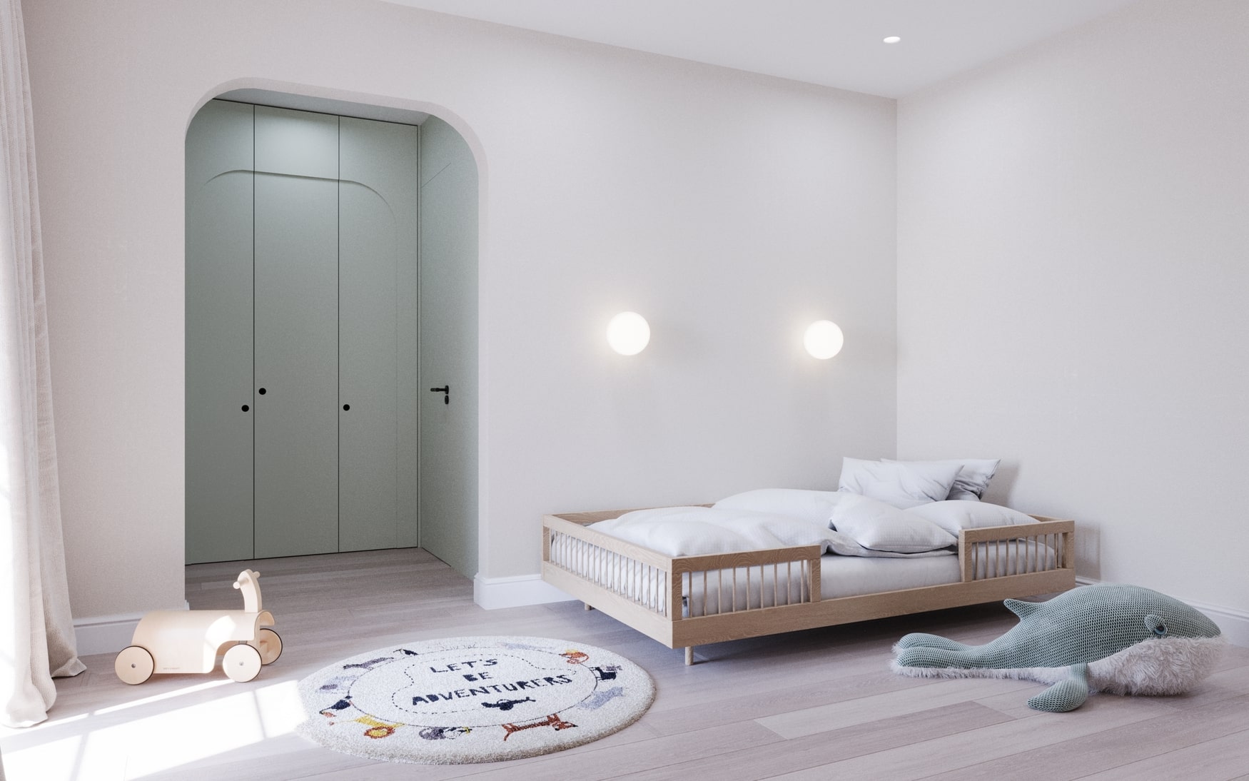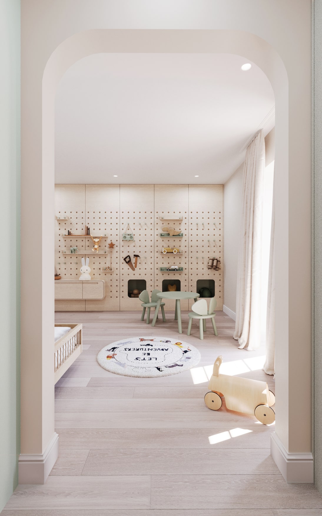 On the opposite end of the hallway, two children’s bedrooms with their own bathrooms offer personalized spaces. One designed for a toddler exudes playful charm, while the other, tailored for a growing boy, reflects a more mature aesthetic.