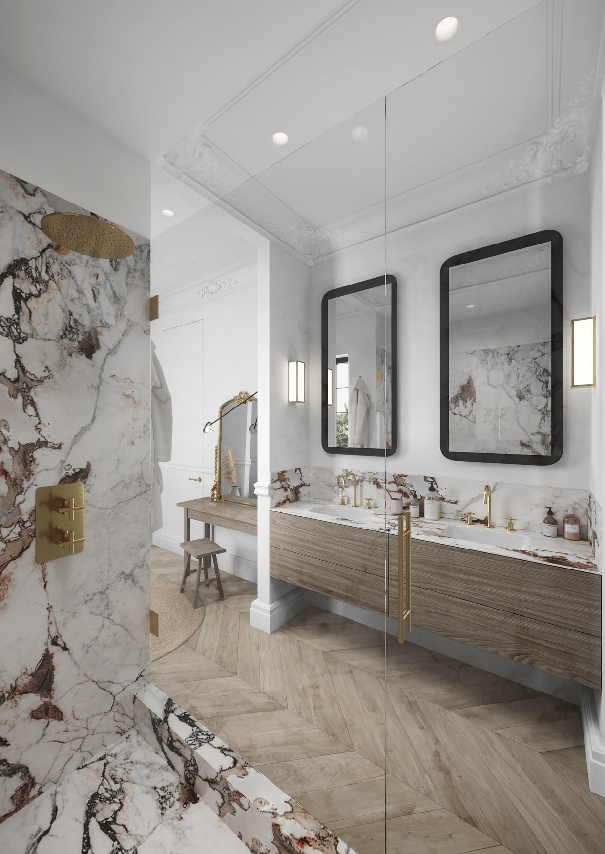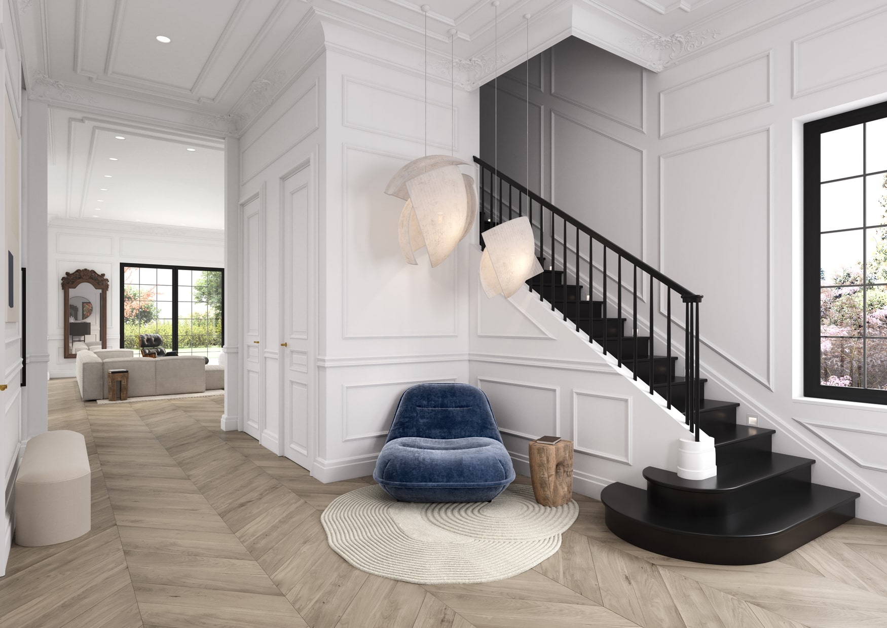 The chevron hardwood floor gives an informal yet extravagant feel and provides a foundation for a warm color scheme that unifies various spaces throughout the four-story house. Large windows, plenty of natural light, wall and ceiling moldings form a rich bond with refined modern furnishings. A true originality of this home derives from an eclectic mixture of contemporary furniture and one-of-a-kind vintage pieces. The outcome is a polished and vibrant home that is a true reflection of the owners’ sensibilities.
