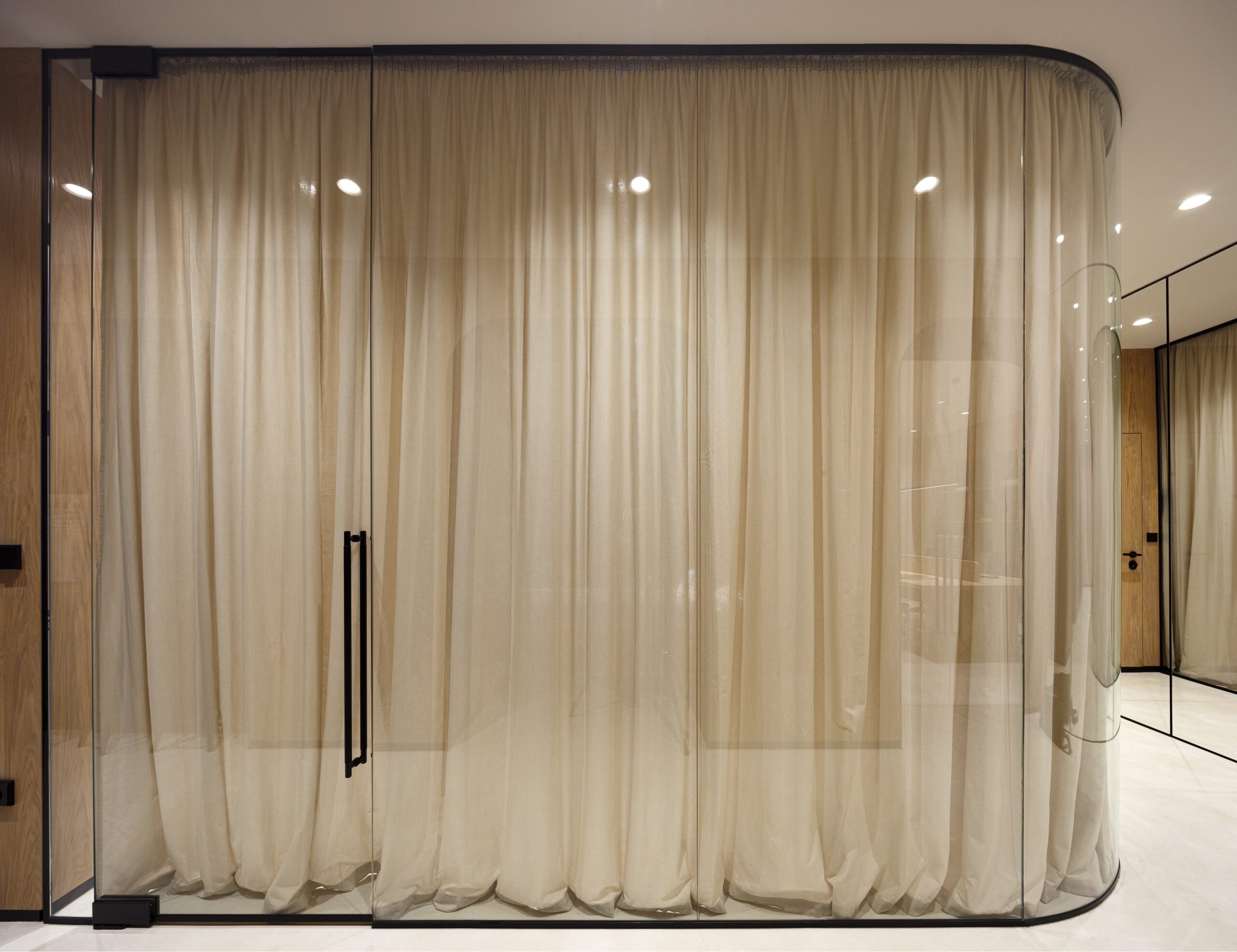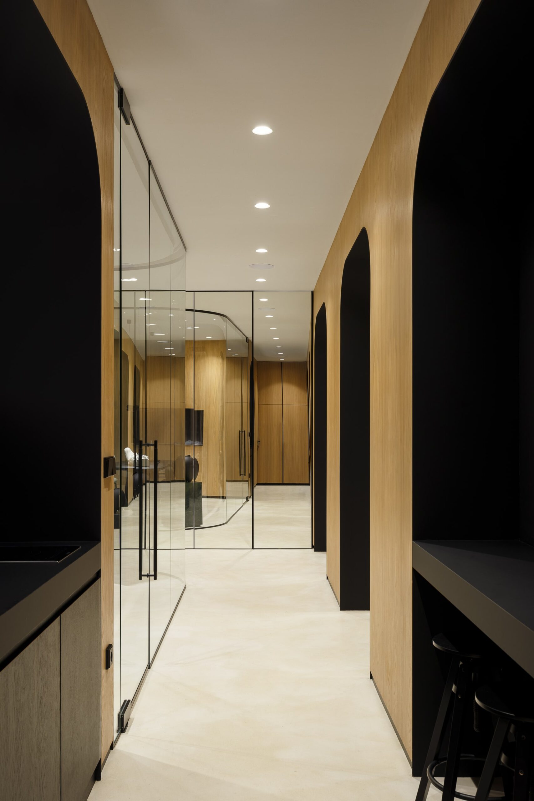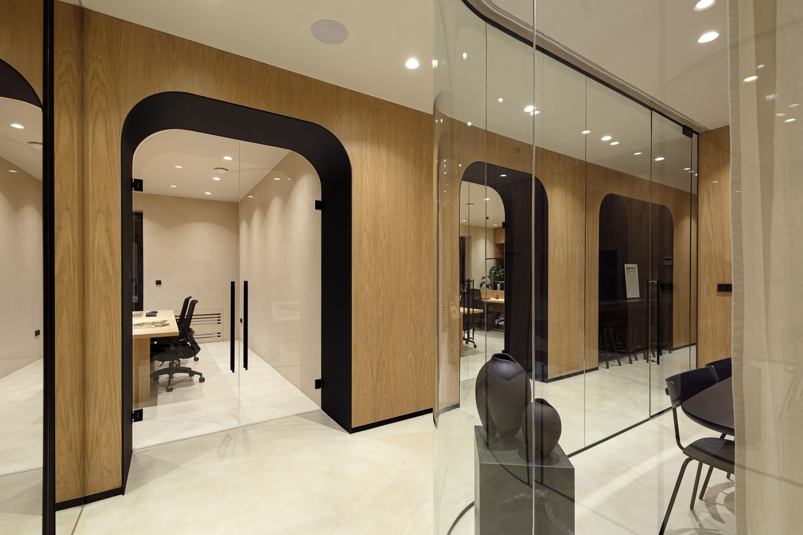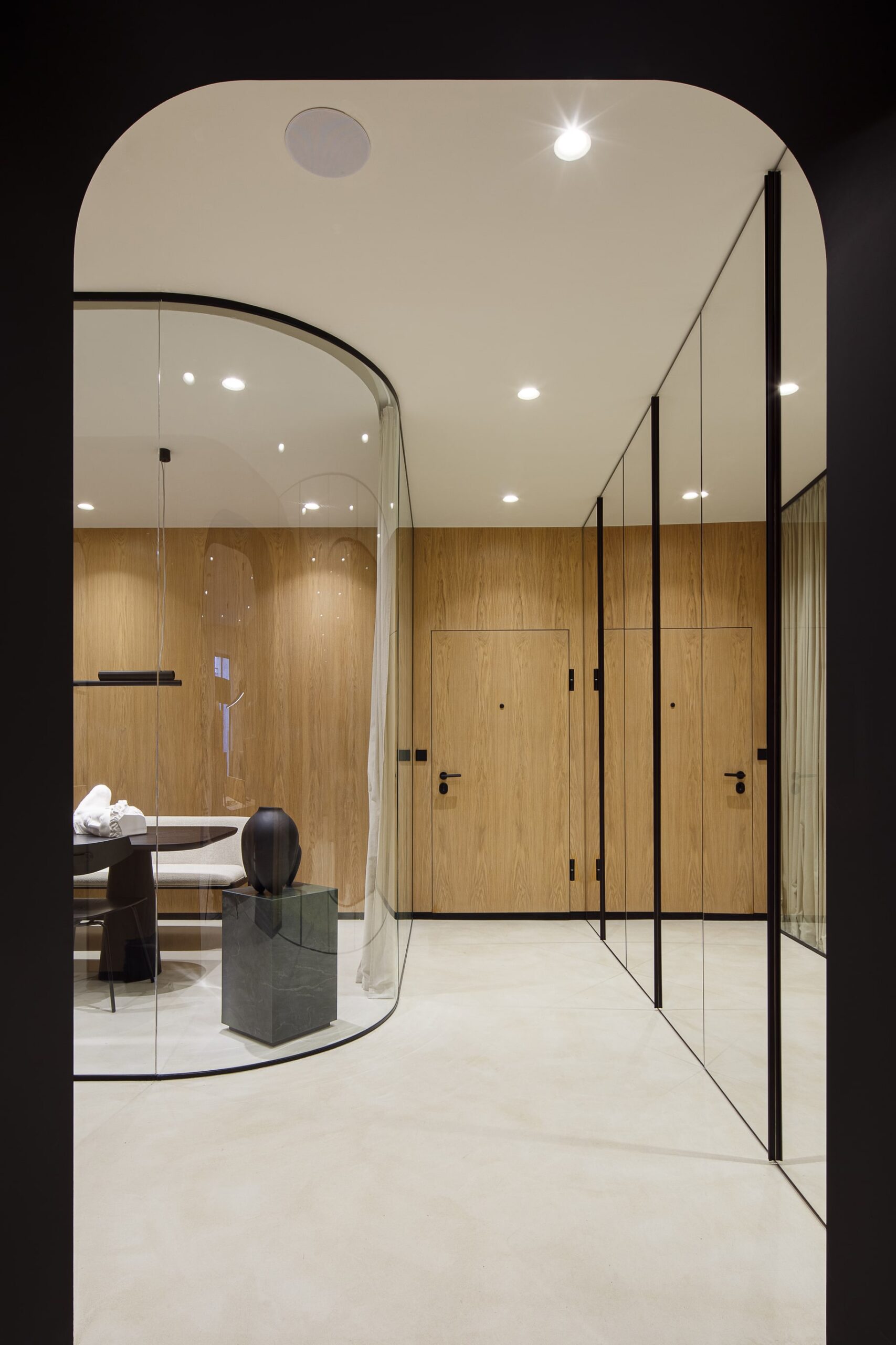 Priority was given to creating spacious and light-filled working areas. It was necessary for the entry volume to be completely redefined. The wall-to-wall wardrobe covered in mirrors on one side and conference room completely enclosed by glass on the other, enhance the open and airy environment. Circulation throughout the office was reconsidered by creating a central hallway treated as the area that unifies spaces deployed around it. Eat-in kitchenette with astonishing marble backsplash was placed at the very end of the corridor.