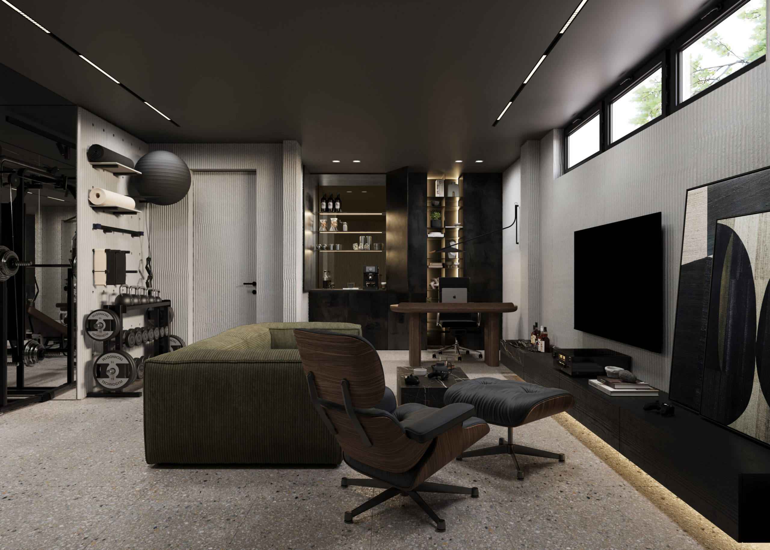 The basement level serves as both a practical and recreational retreat. With direct access from the garage, it houses essential utility and service areas. A dedicated “man cave” combines an office, gym, and lounge space, offering a secluded escape for work and relaxation.