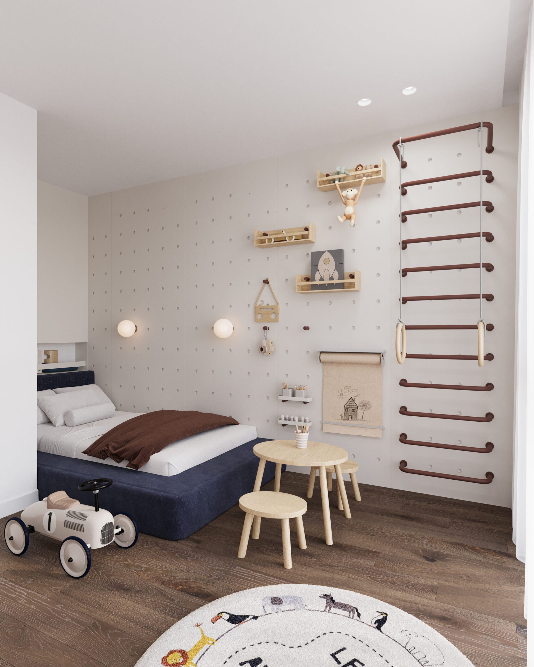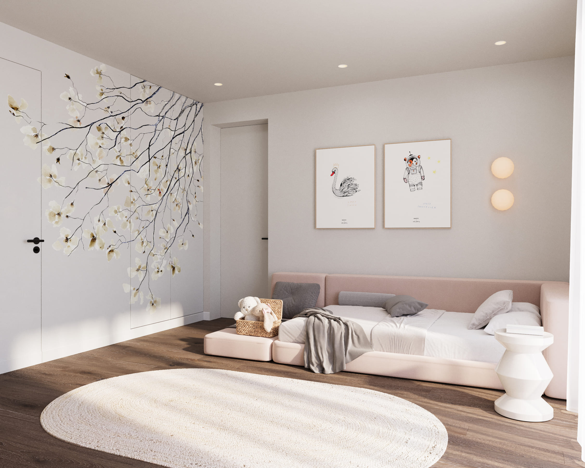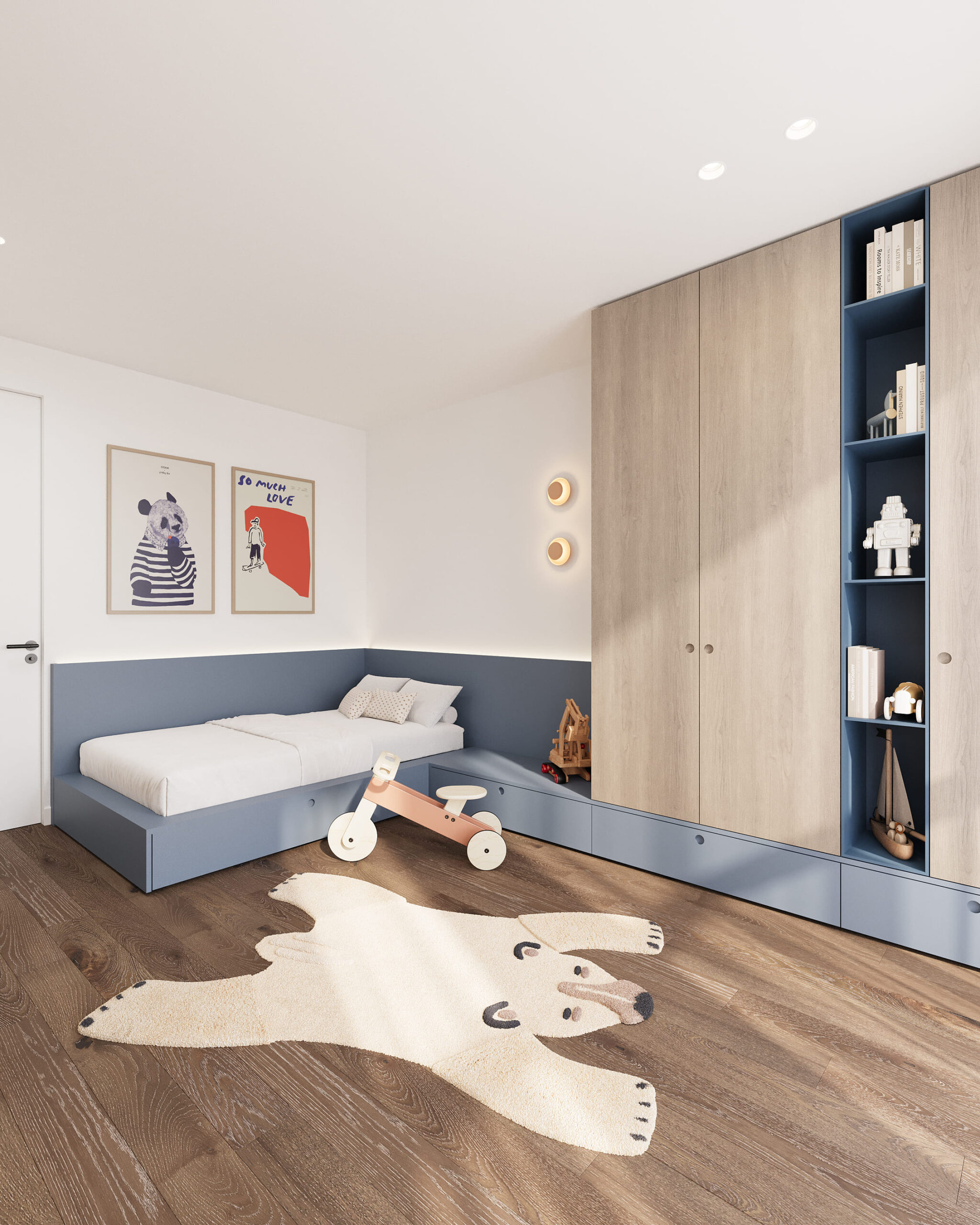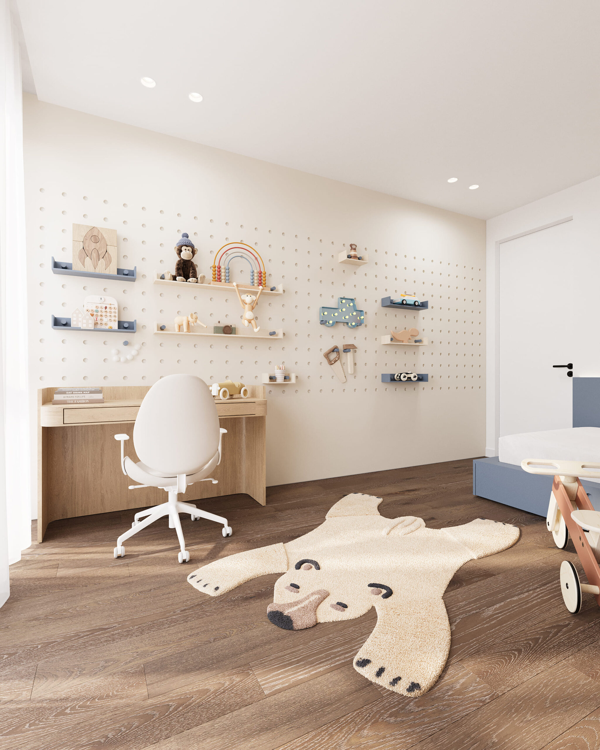 Dedicated entirely to the younger family members, the first floor offers custom-designed bedrooms tailored to each child’s interests and lifestyle. The boys share a stylish bathroom, while the eldest daughter enjoys a private space.