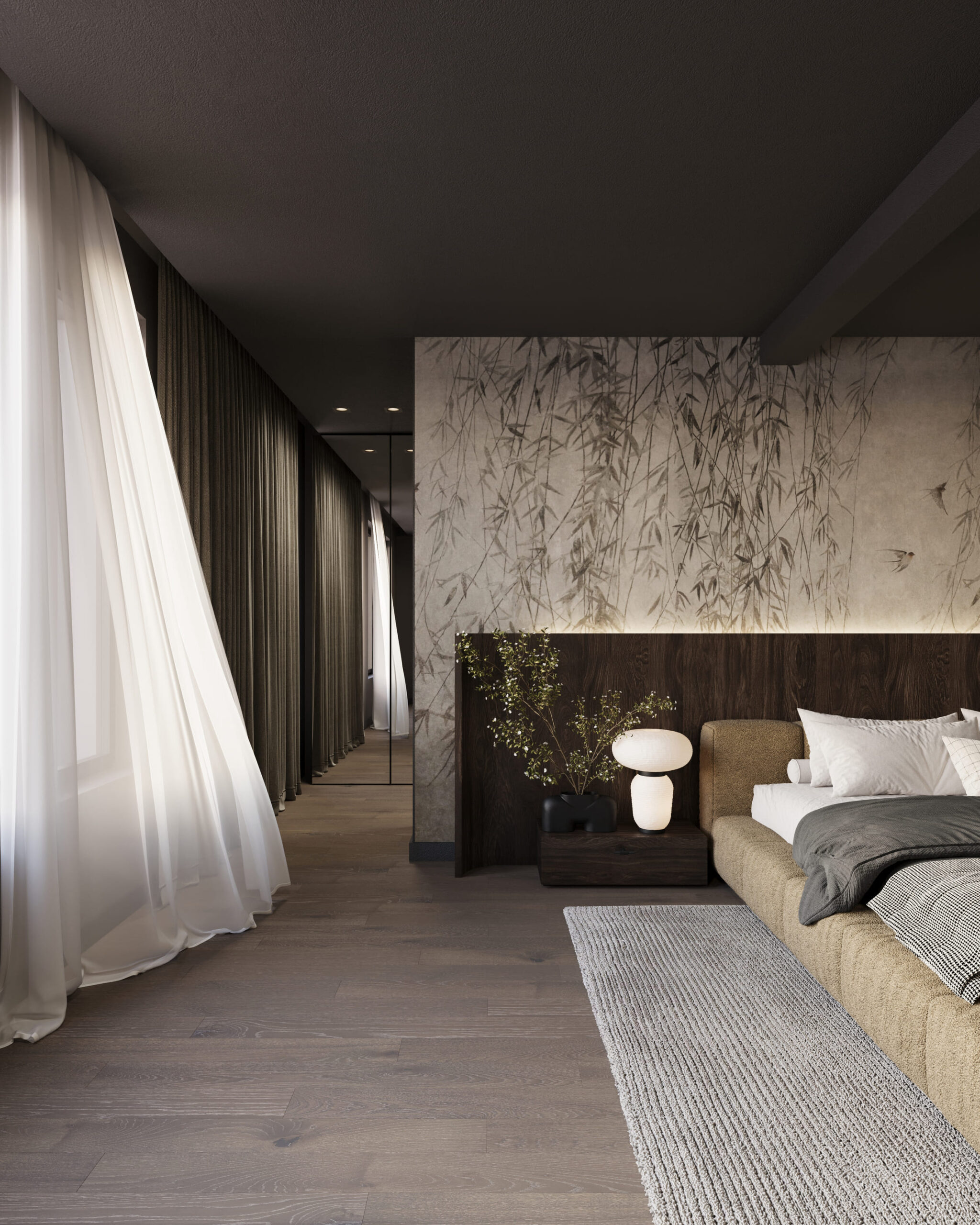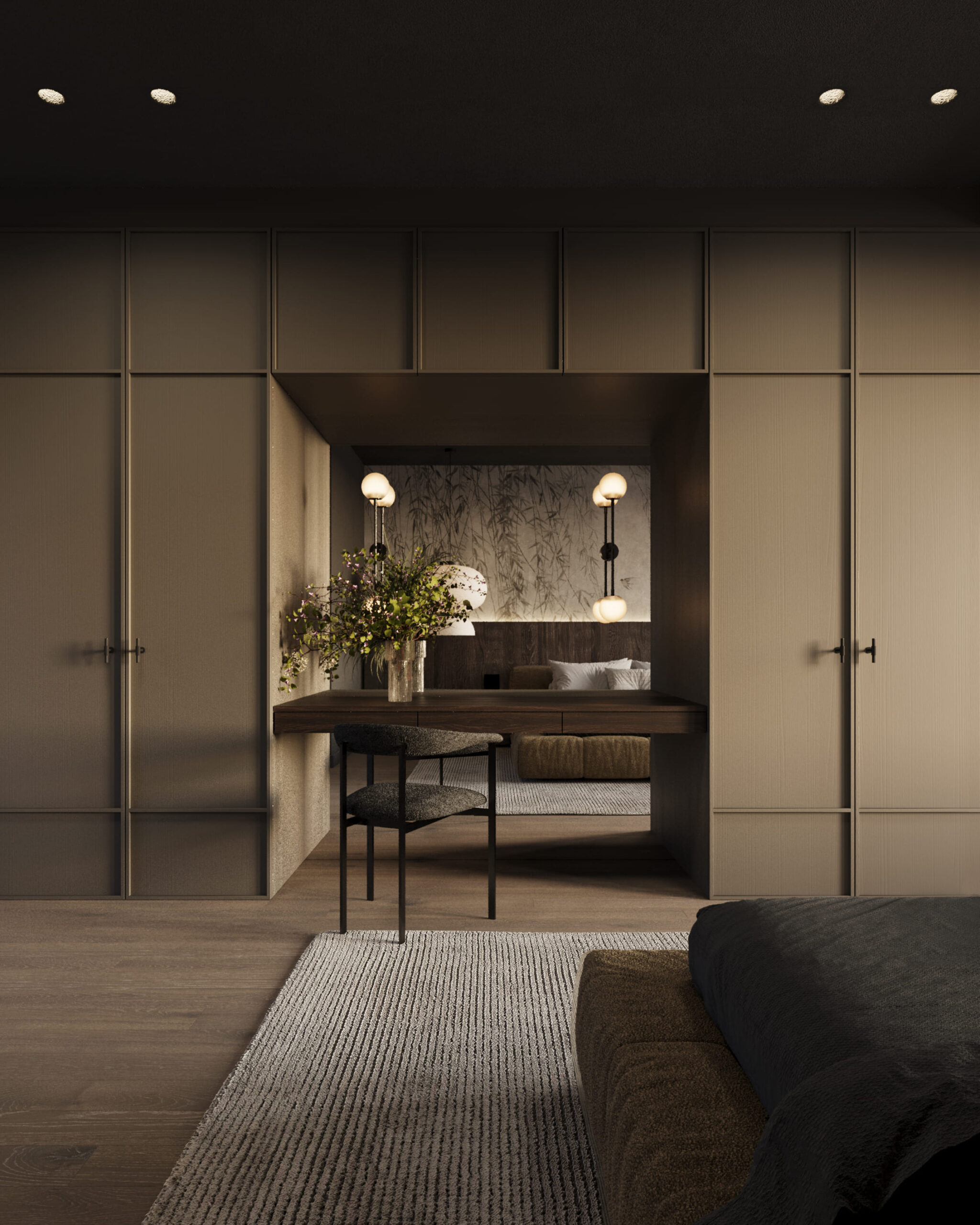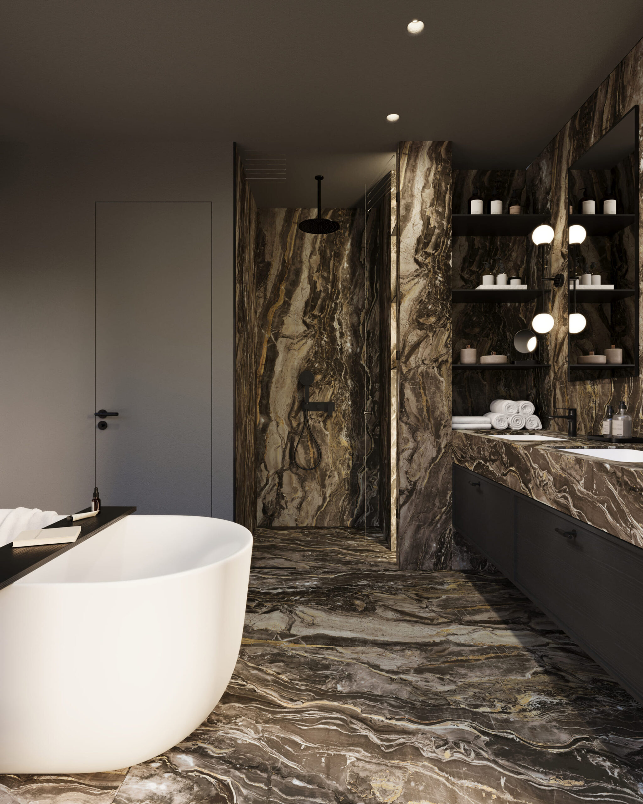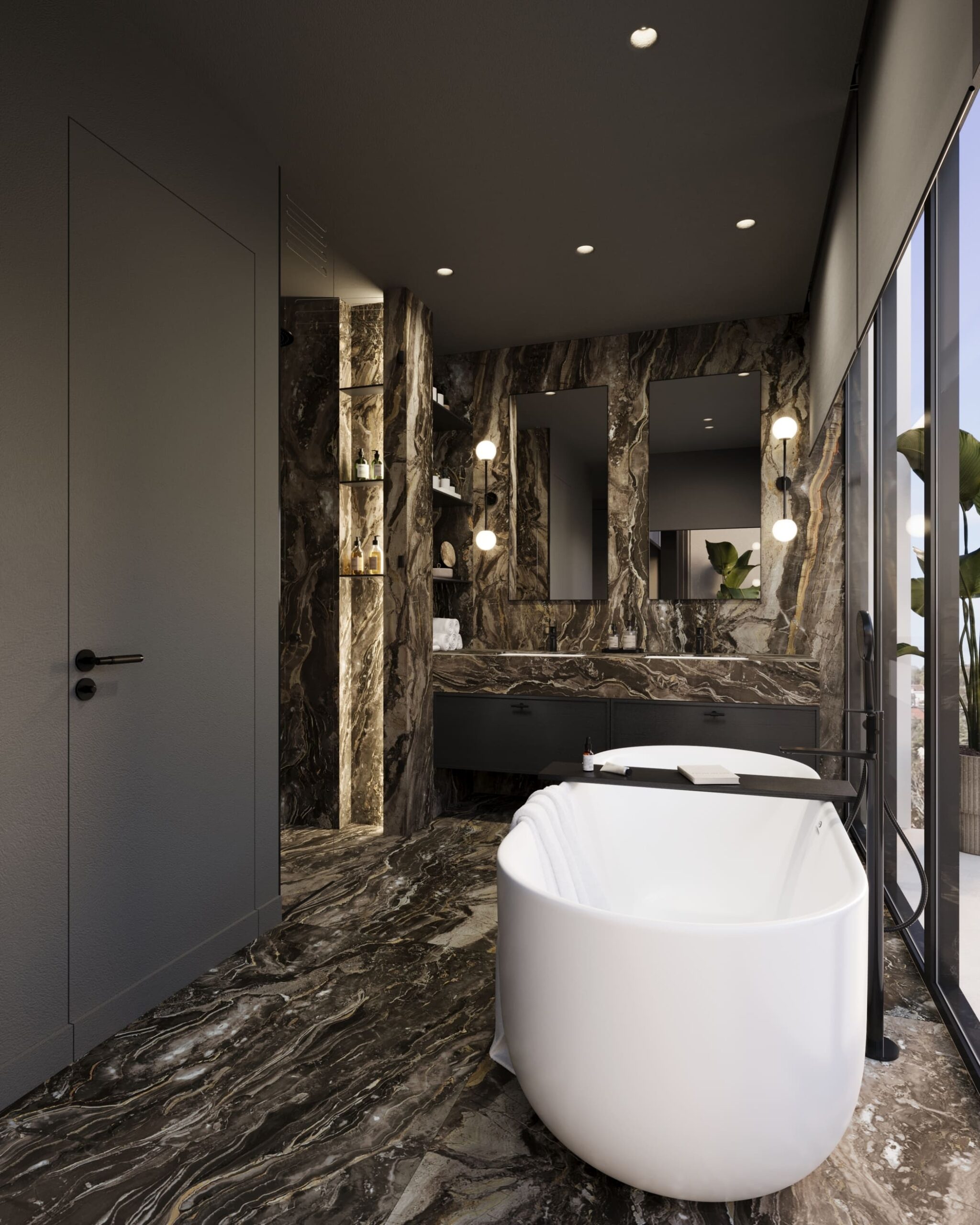 The top floor is an elegant escape for the parents, designed as a seamless open-concept suite. The master bathroom, rich in textures and deep tones, offers a serene sanctuary—an ideal space for relaxation and rejuvenation.