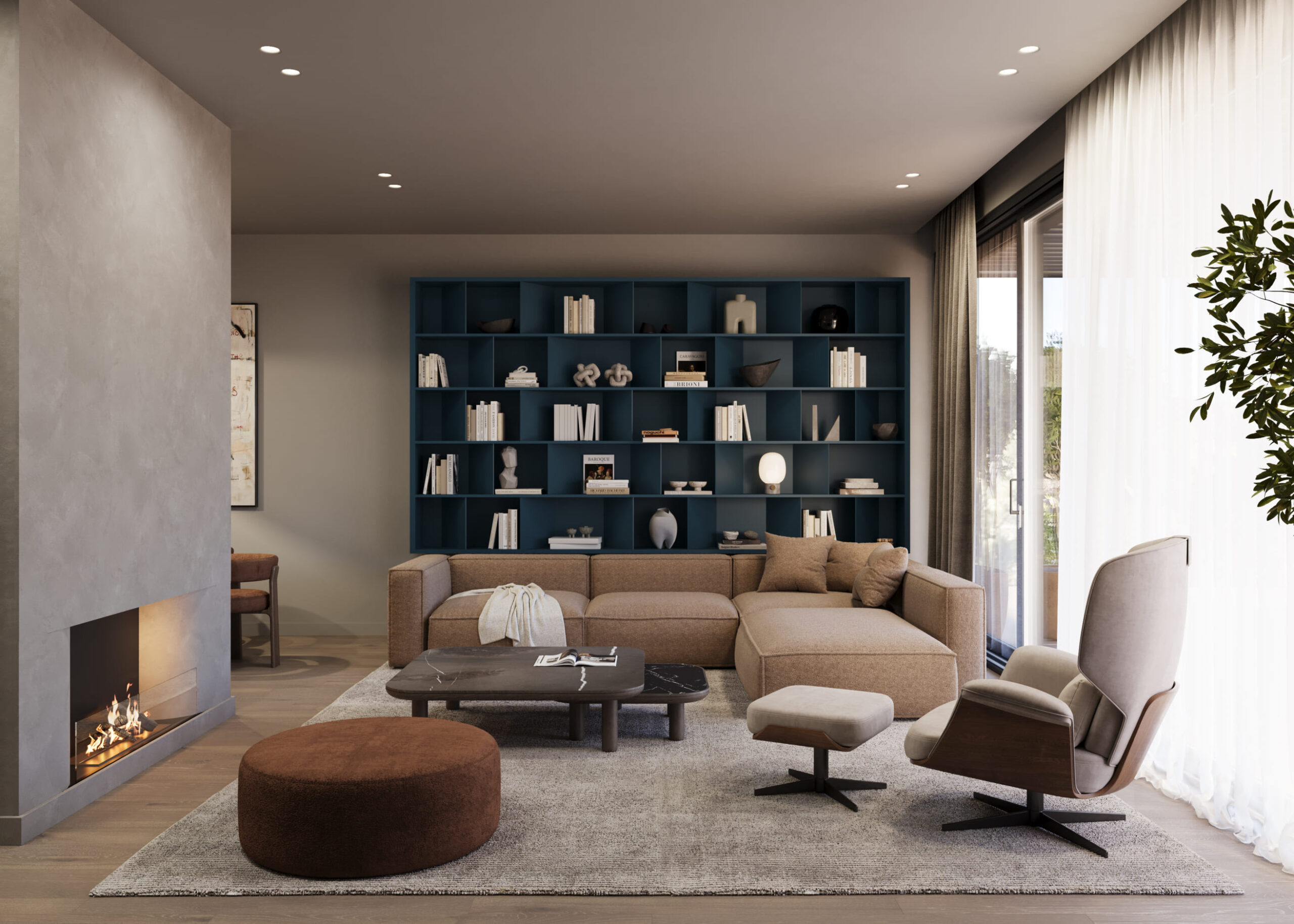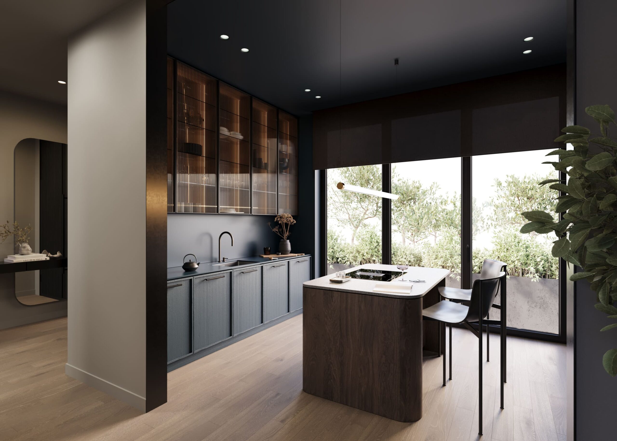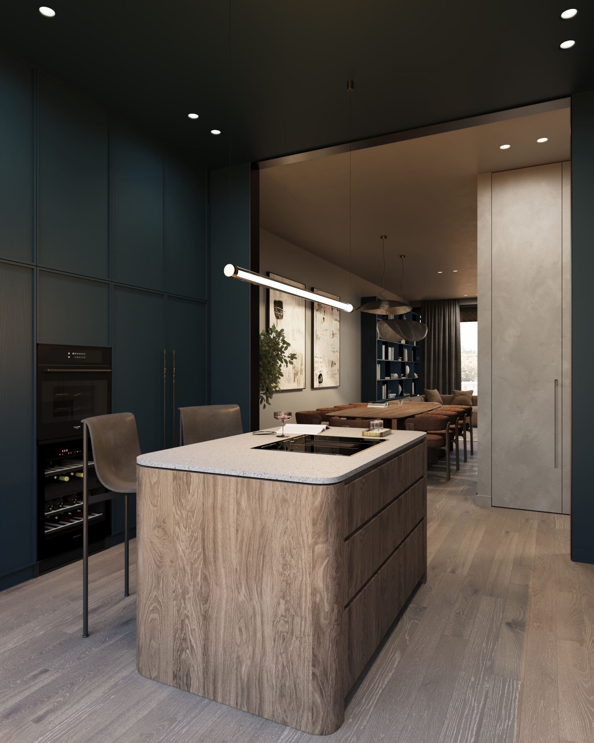 A striking navy-blue kitchen overlooks the street, with its deep hues enriched by a mix of materials. The walnut kitchen island, topped with quartz, anchors the space with warmth and elegance. Extending from the kitchen, the dining room embraces bold, dark tones, balancing dramatic design with a welcoming atmosphere. The grandeur of the living room unfolds in a vivid color palette, injecting personality and energy into the home’s social hub.