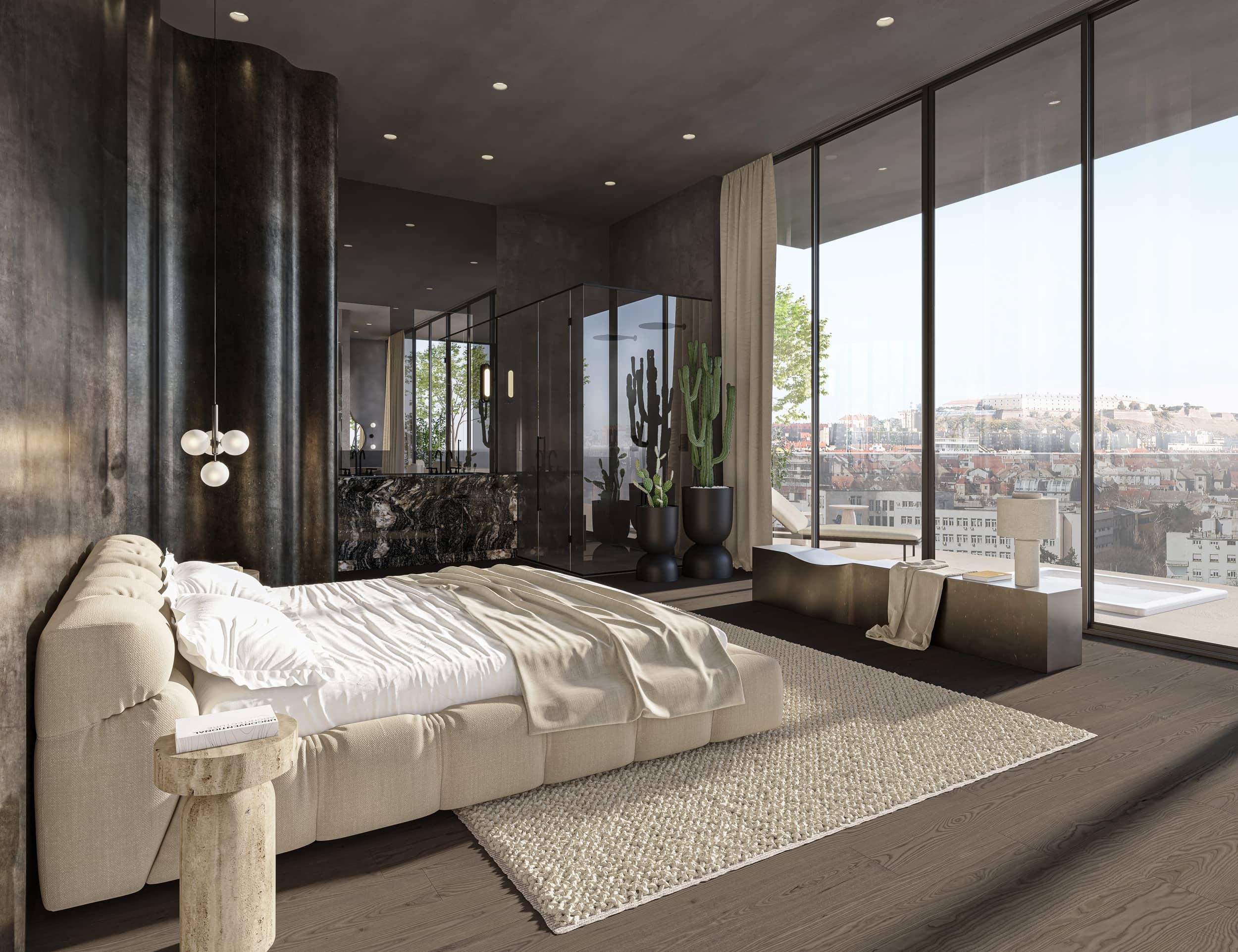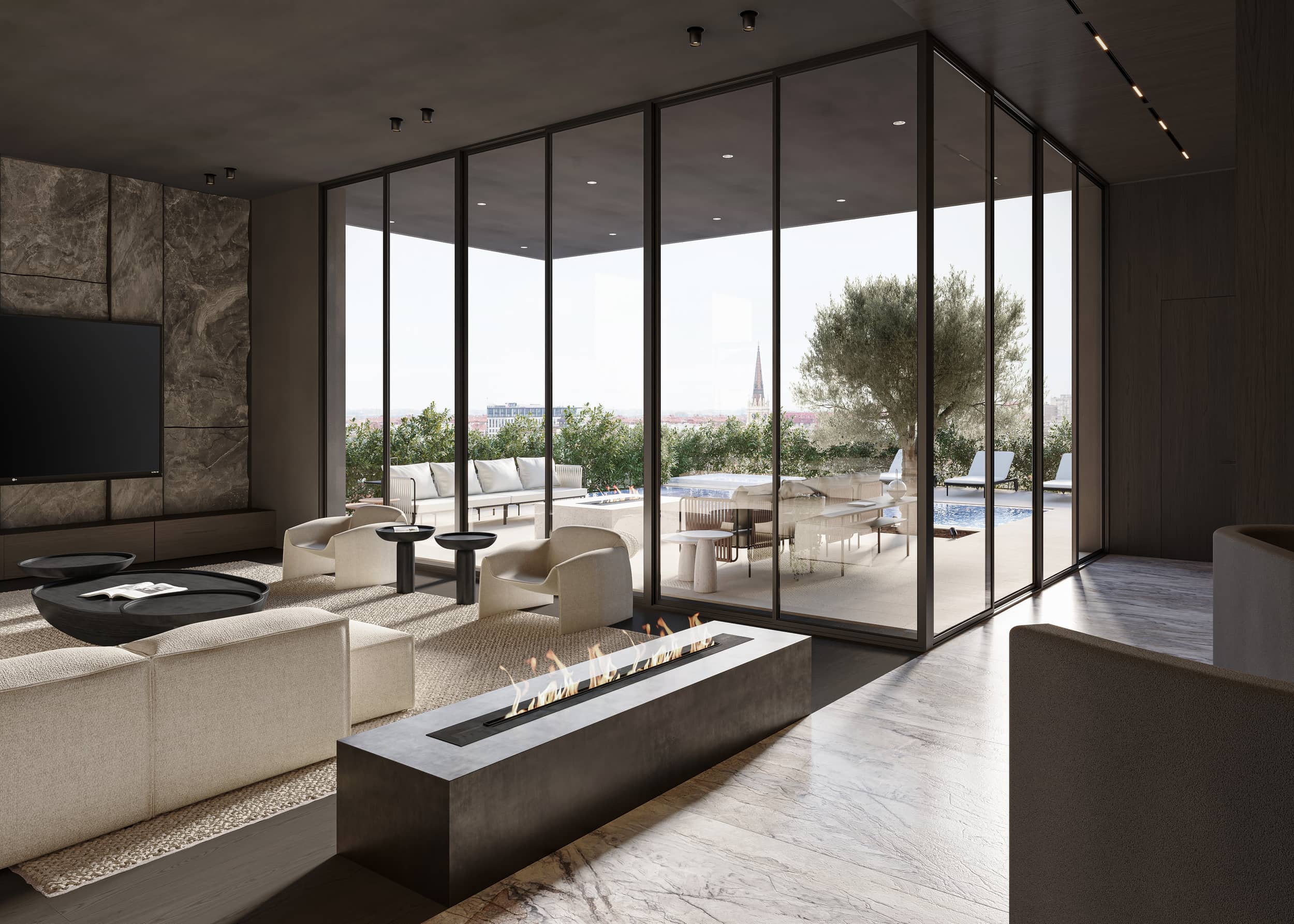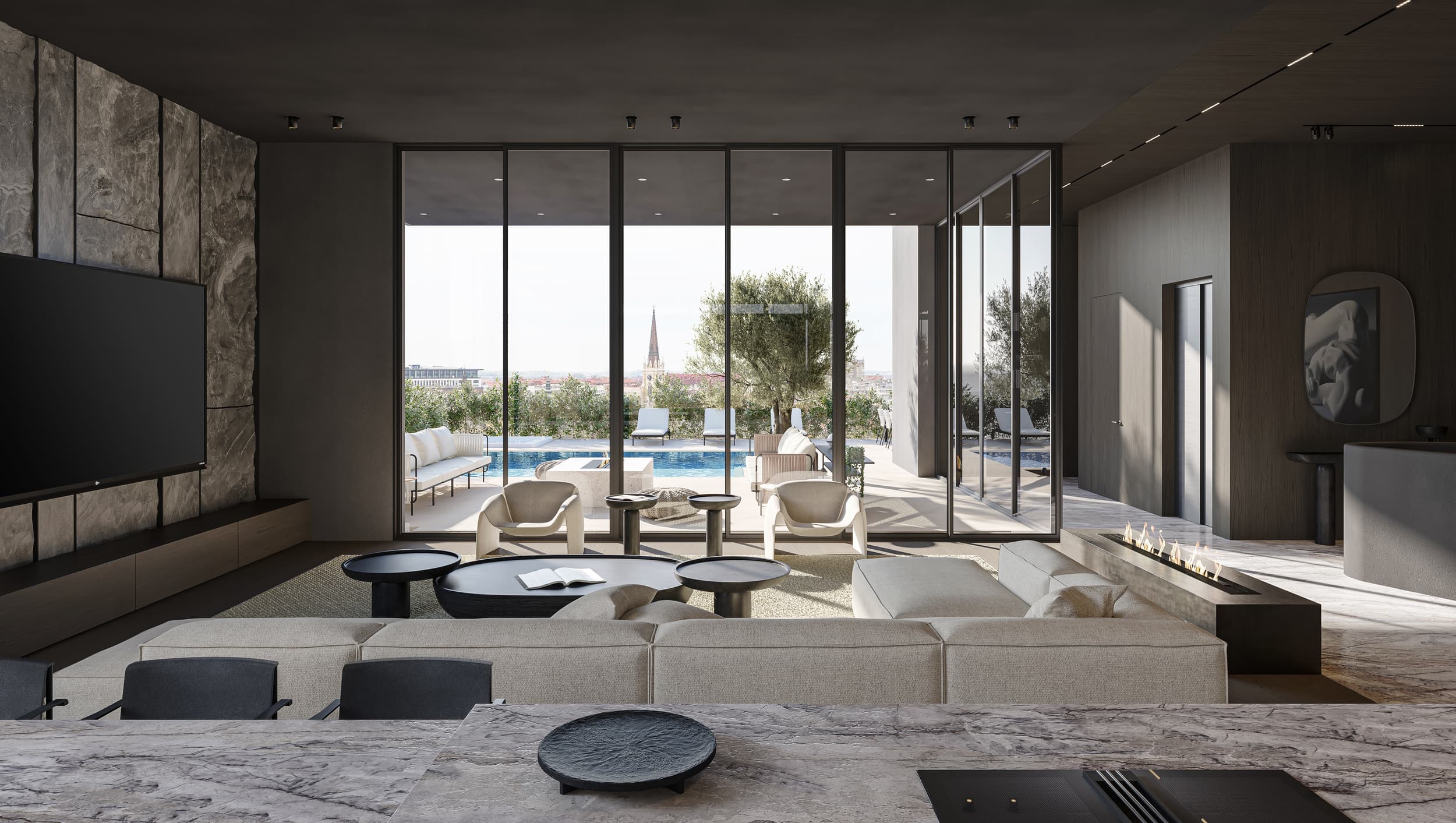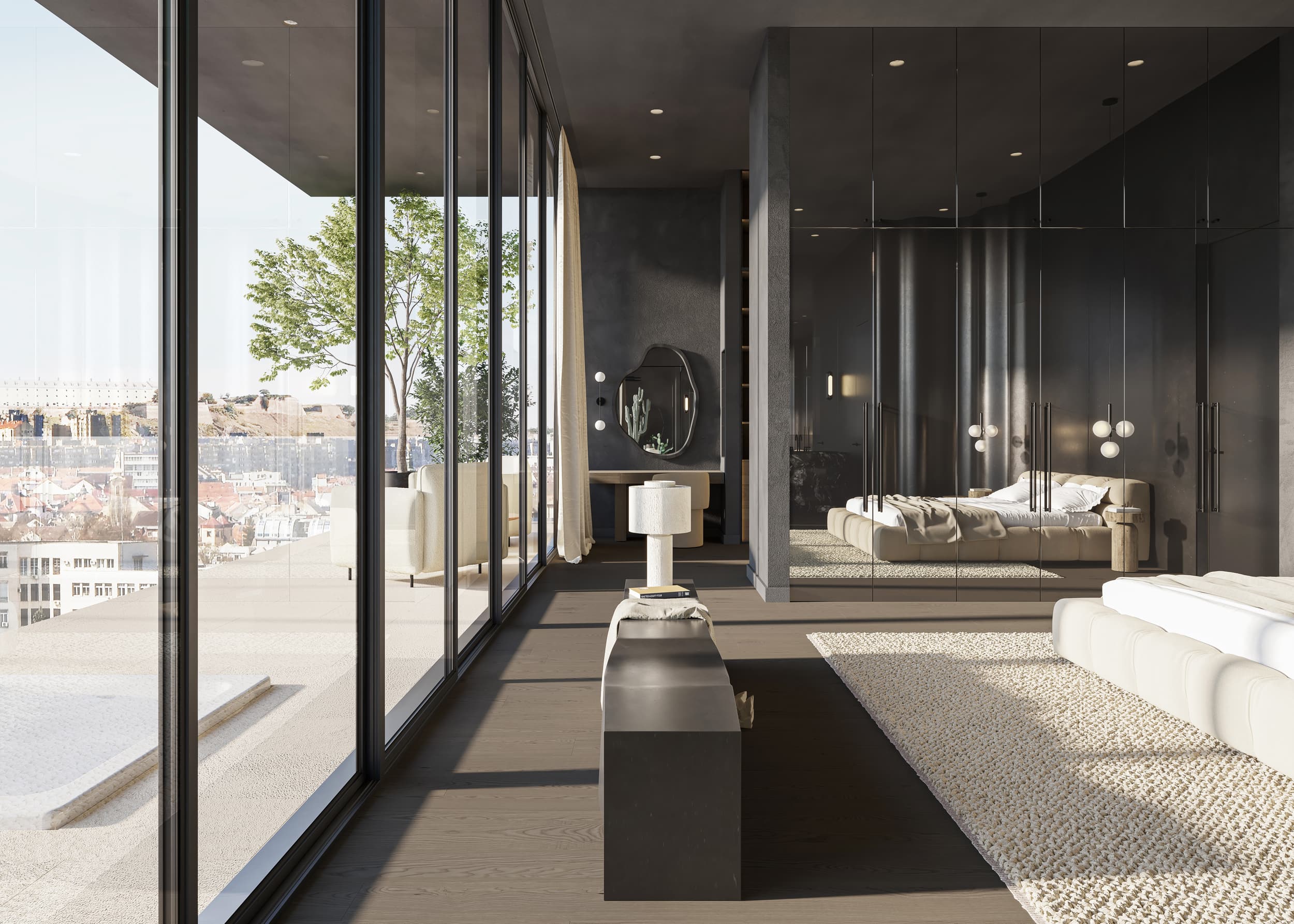 Oversized windows flood the space with natural light and blur the lines between the interior and the cityscape beyond. Walls and ceiling in the living room area, clad in the same natural clay exude warmth and a tactile appeal, are complemented by wooden accent walls and ceiling adorning the hallway. Marble and dark parquet floors, natural stone-clad TV wall and a minimalistic metal fireplace contribute to the penthouse’s meticulous design, while mirror-clad kitchen cabinets ingeniously reflect the cityscape, creating a dynamic and ever-changing interior canvas.