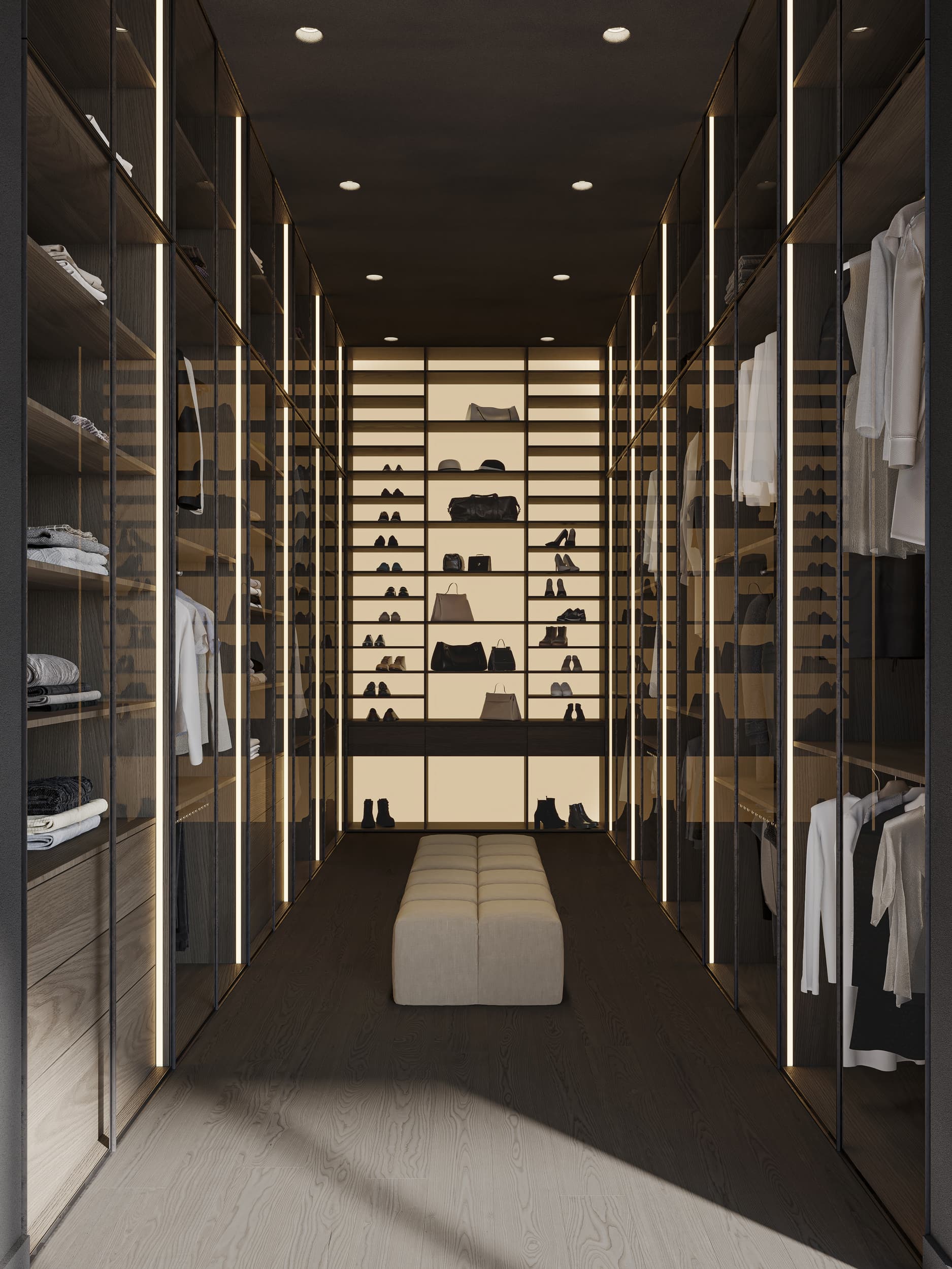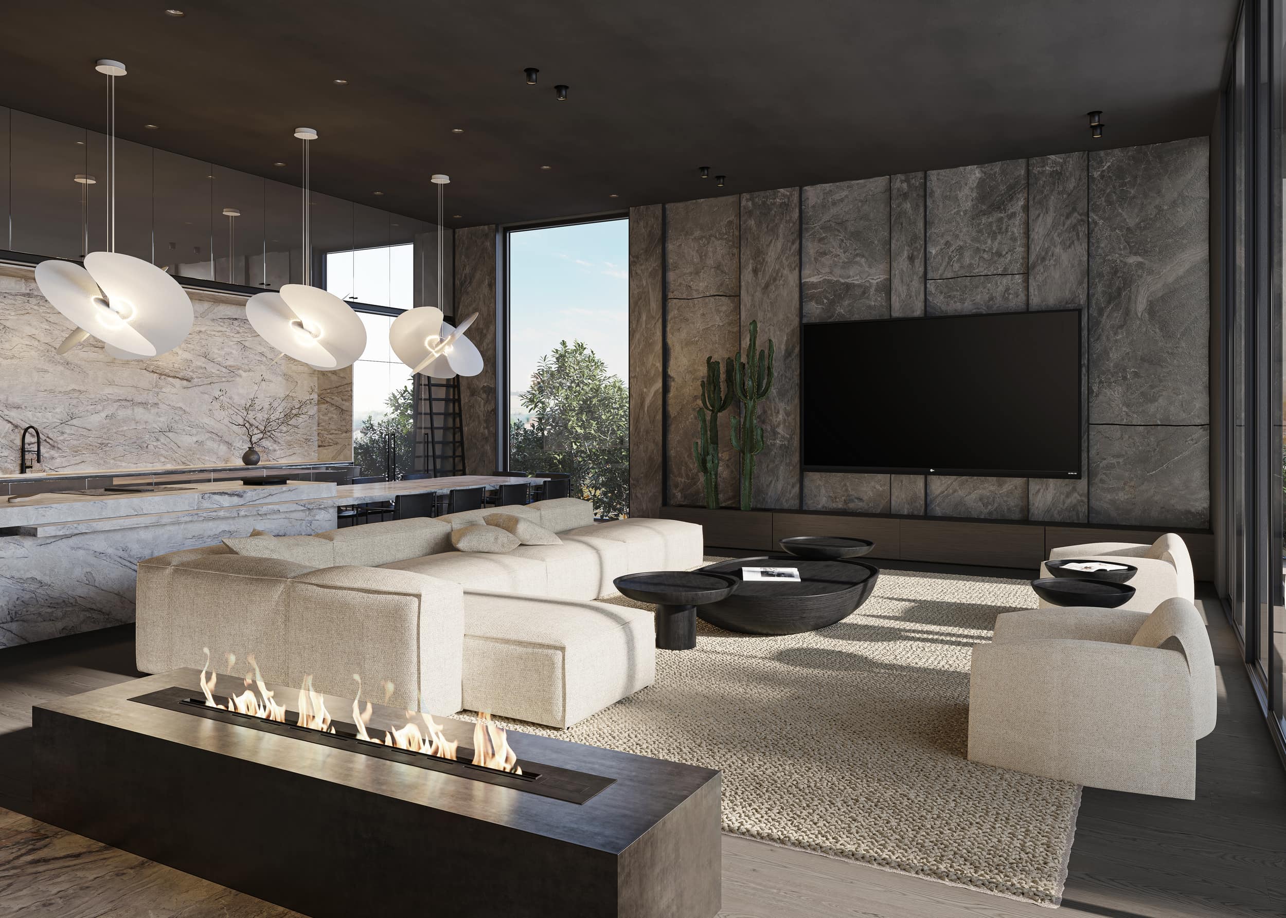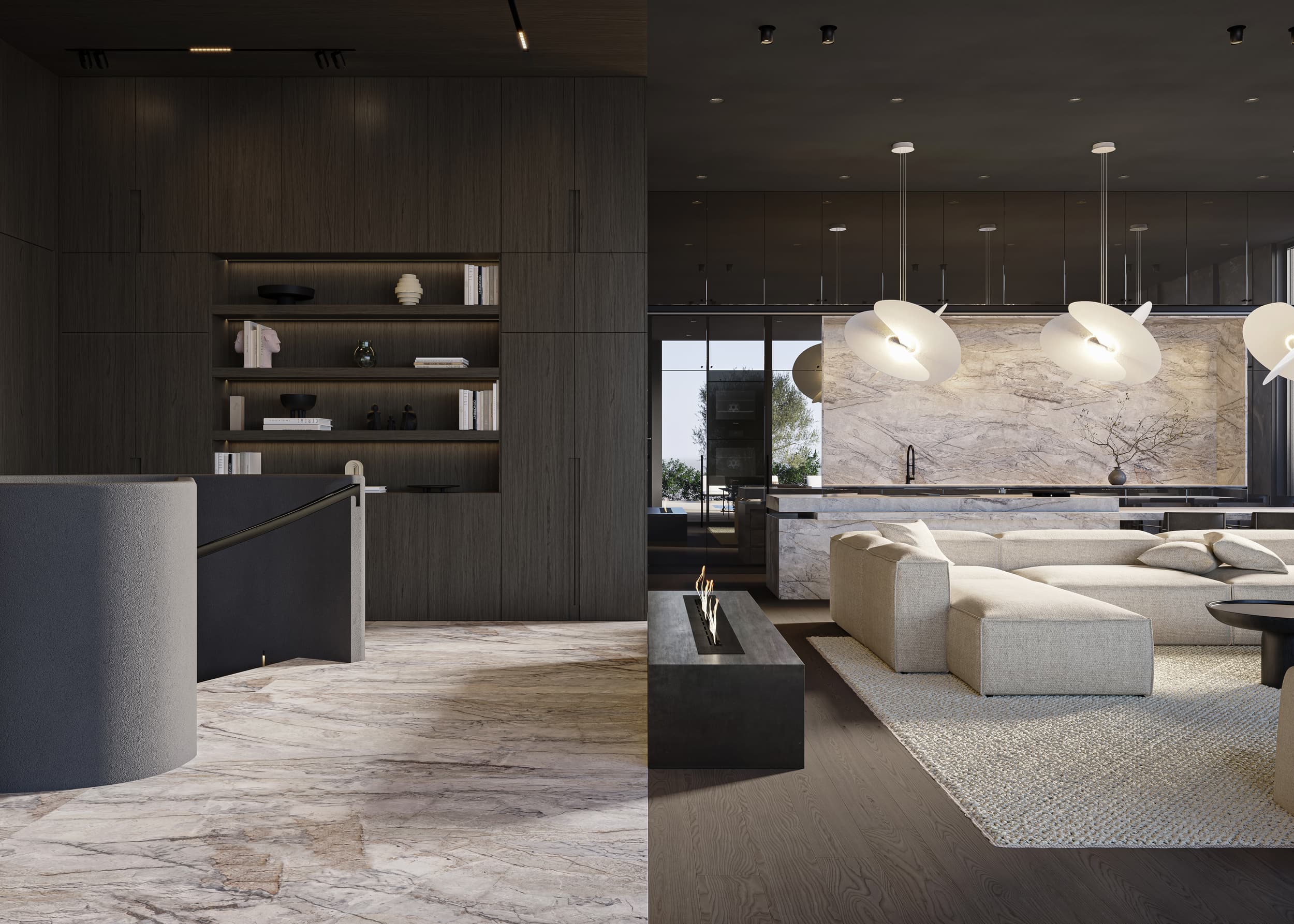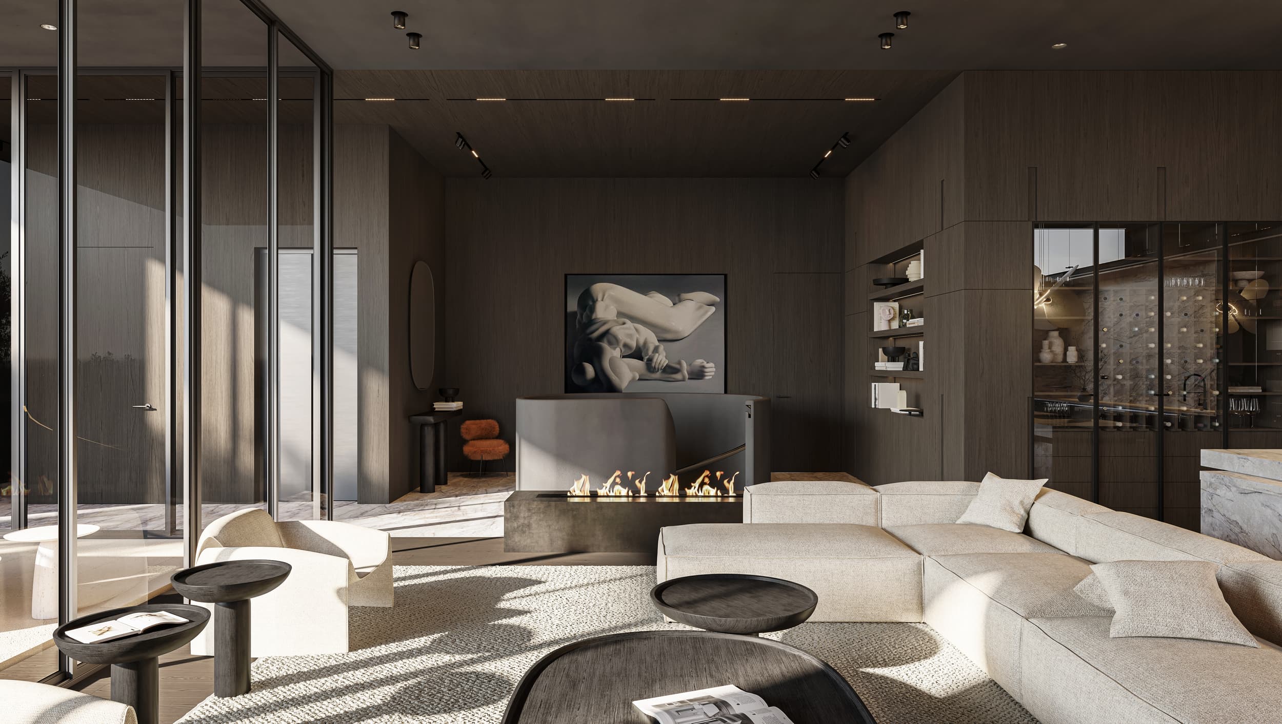 Oversized windows flood the space with natural light and blur the lines between the interior and the cityscape beyond. Walls and ceiling in the living room area, clad in the same natural clay exude warmth and a tactile appeal, are complemented by wooden accent walls and ceiling adorning the hallway. Marble and dark parquet floors, natural stone-clad TV wall and a minimalistic metal fireplace contribute to the penthouse’s meticulous design, while mirror-clad kitchen cabinets ingeniously reflect the cityscape, creating a dynamic and ever-changing interior canvas.