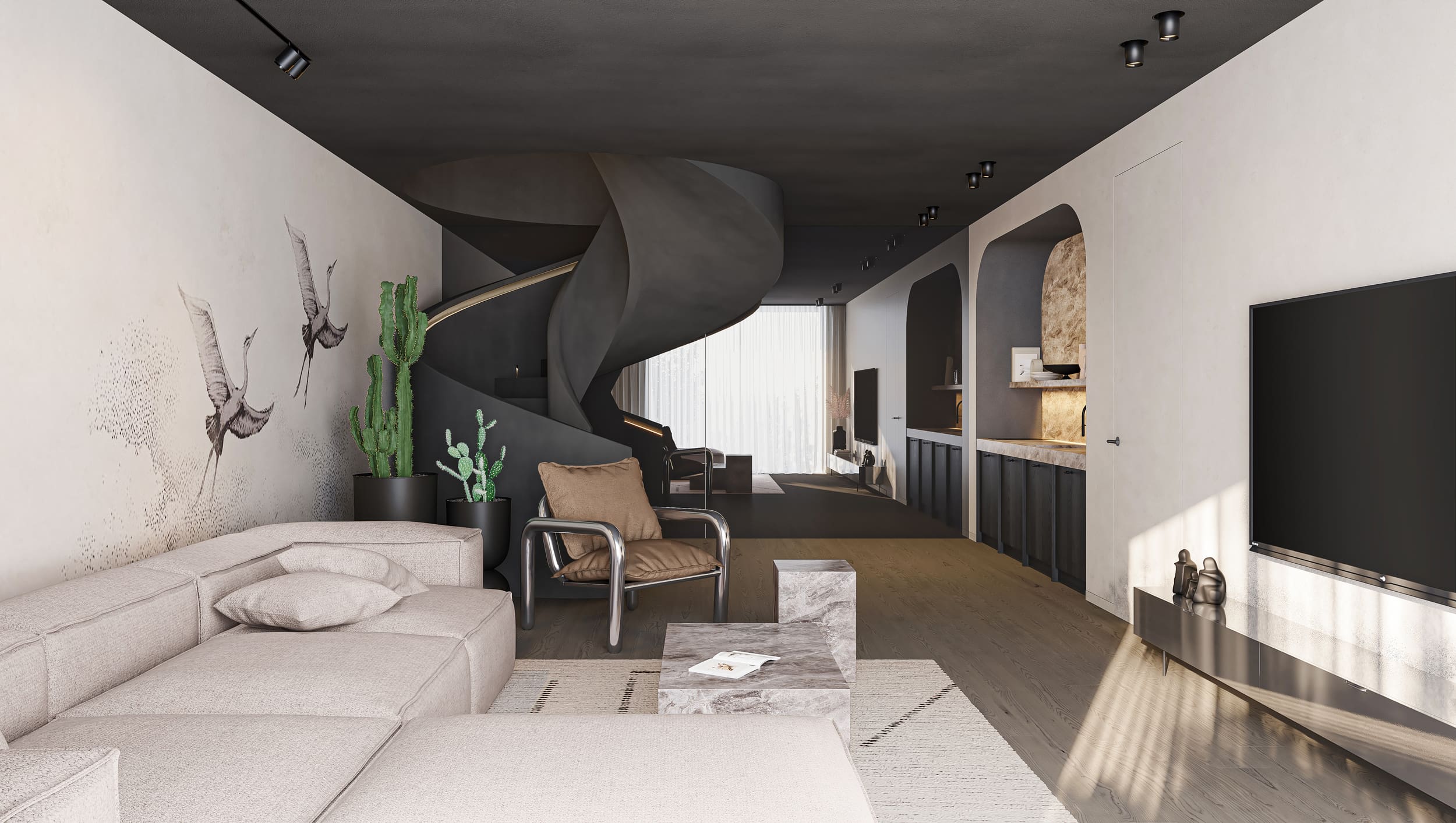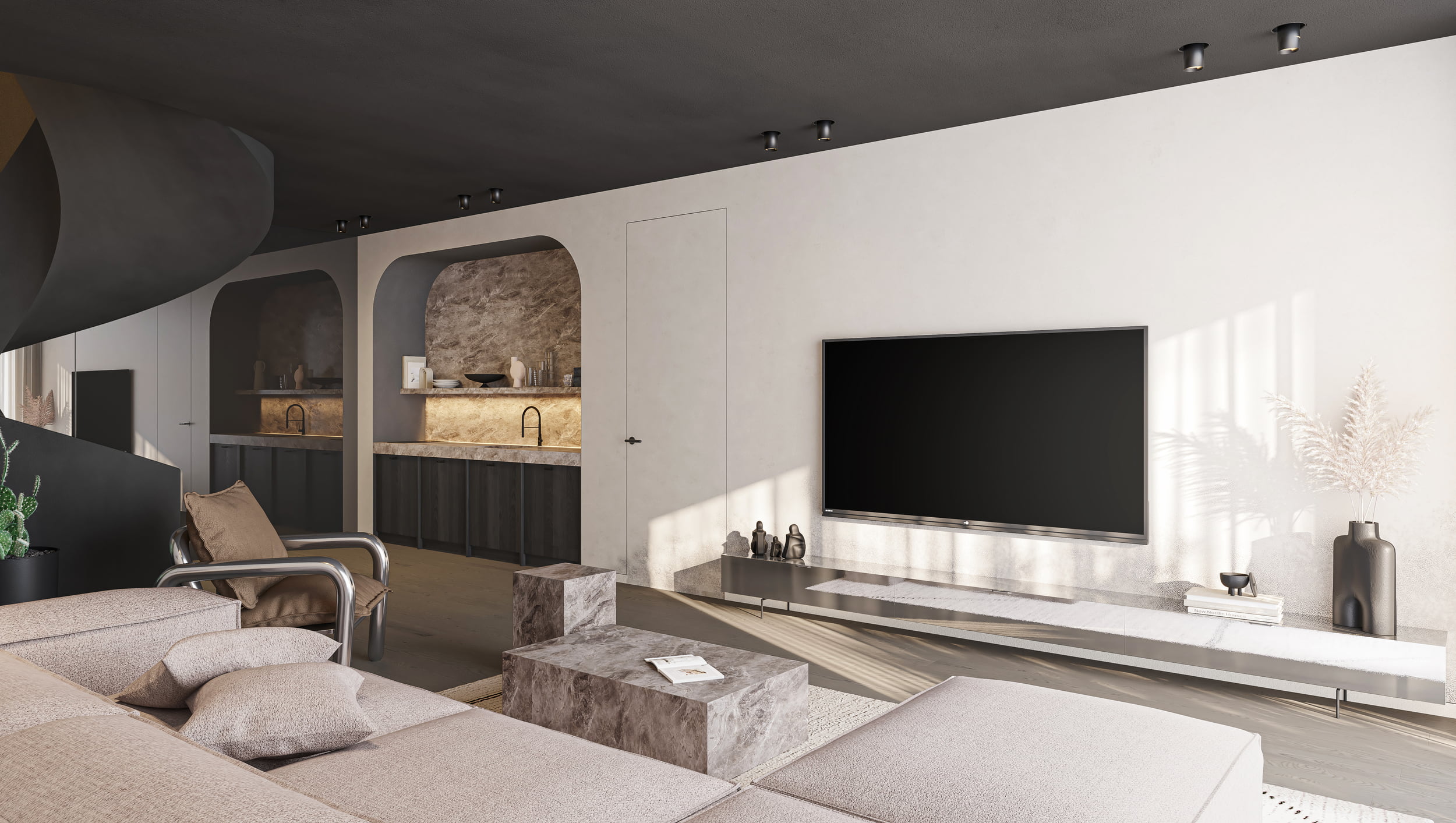 This two-story retreat is connected by a sculptural masterpiece: a spiral staircase adorned in natural clay that sets the tone for the sophisticated design that unfolds within. Key living areas are harmoniously united on the upper, while lower floor accommodates a vibrant and playful space designed for the younger members of the family.