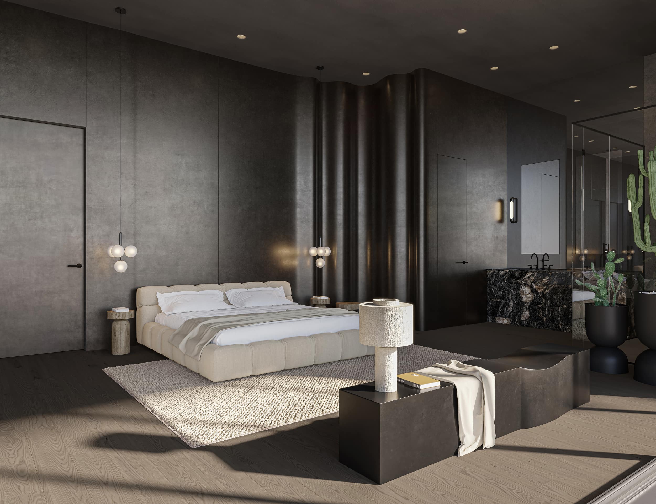 The master bedroom, a serene sanctuary, is an oasis of tranquility. Dark hues invite relaxation, while strategically placed light colored furniture provides a modern contrast. The sculptural and curved metal wall cover becomes a focal point, adding a touch of drama to the room.