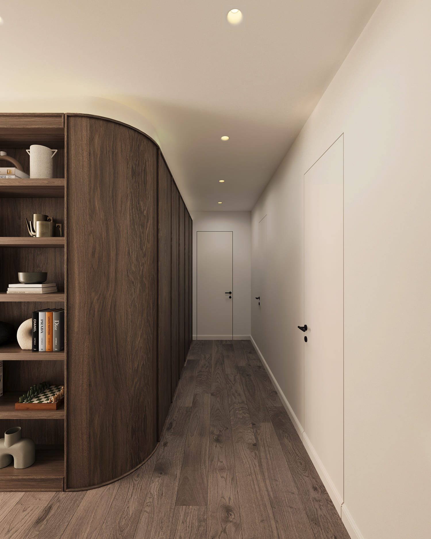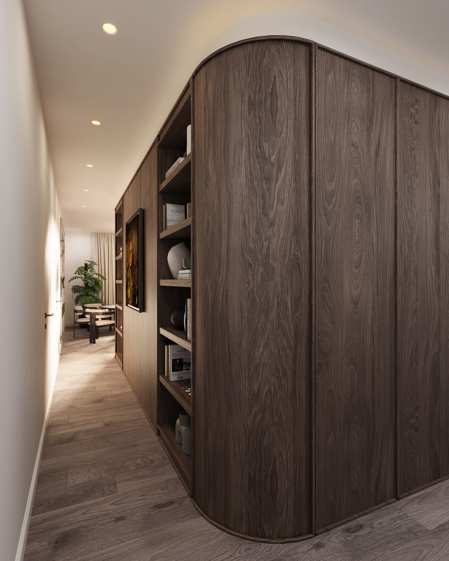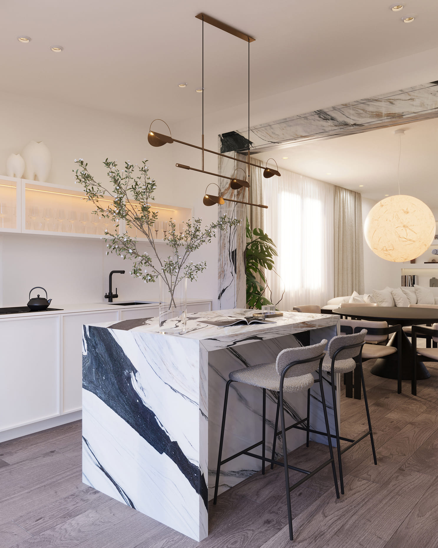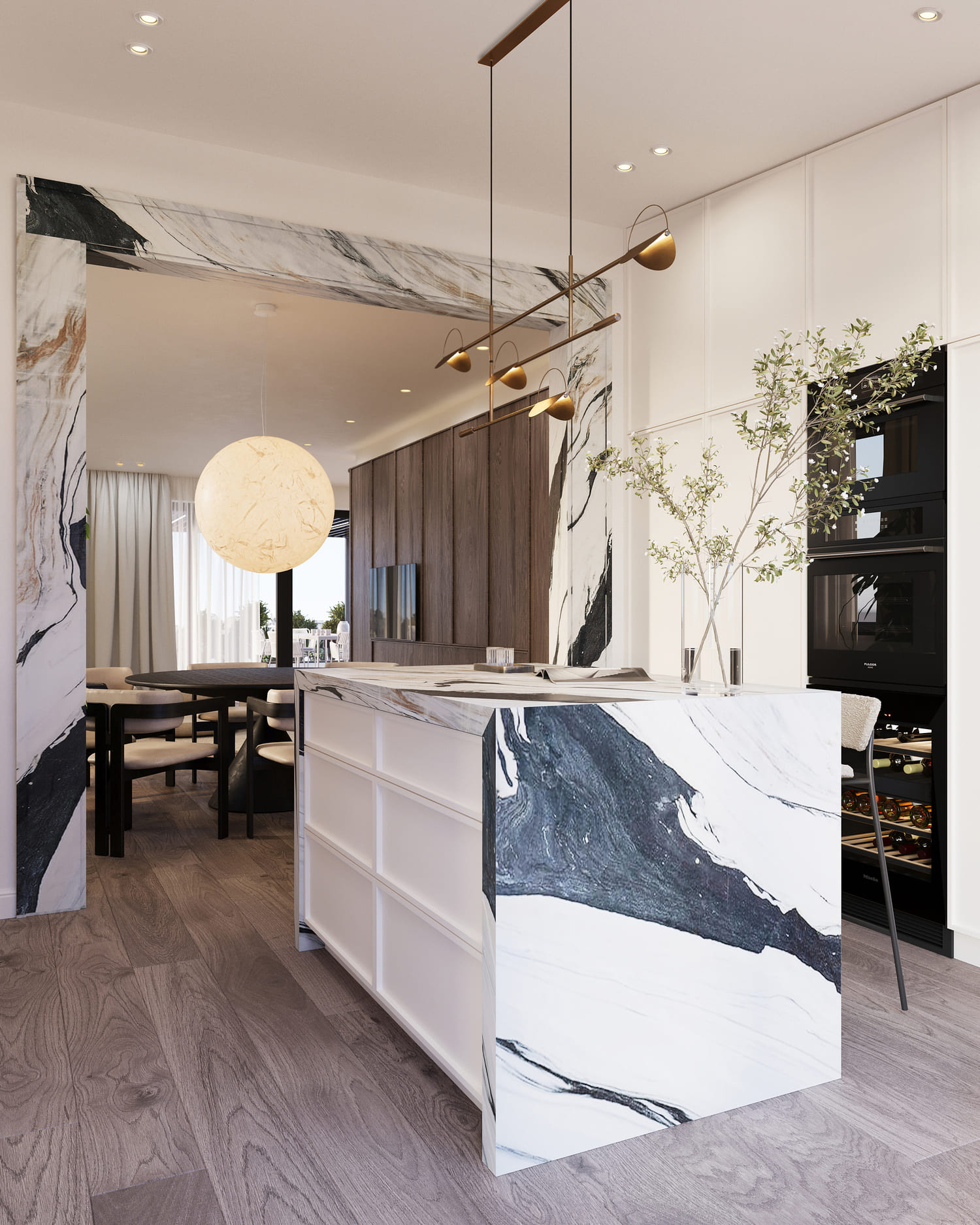 A striking oak centerpiece with rounded edges runs from the entrance to the hallway, evolving from a wardrobe to a TV unit with an aquarium, storage, library, and utility space. In the dining area, a Desalto Clay round table and Davide Groppi pendant light command attention, while a Panda Marble portal marks the entrance to a sleek, neutral-toned kitchen that lets bold marble textures shine.